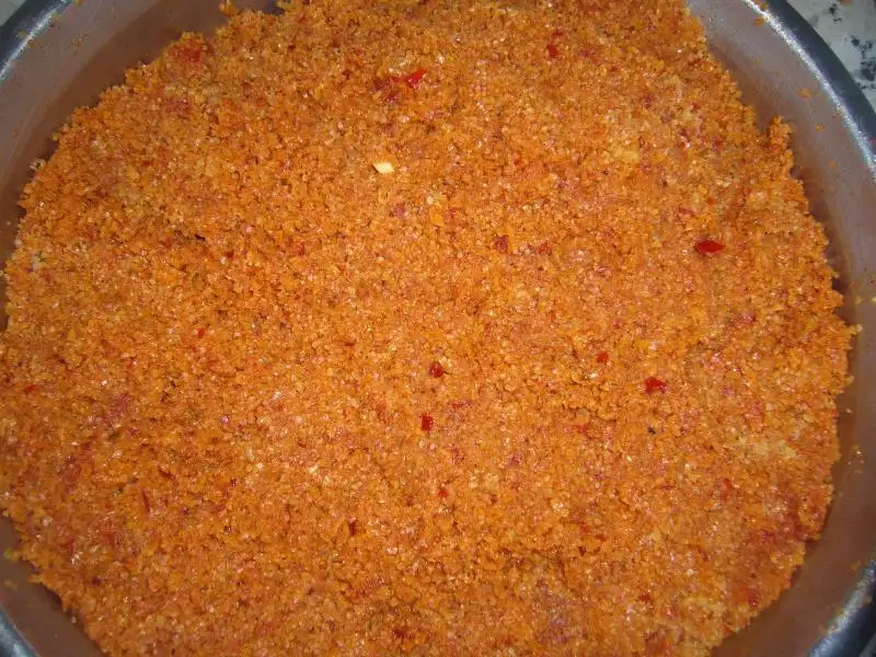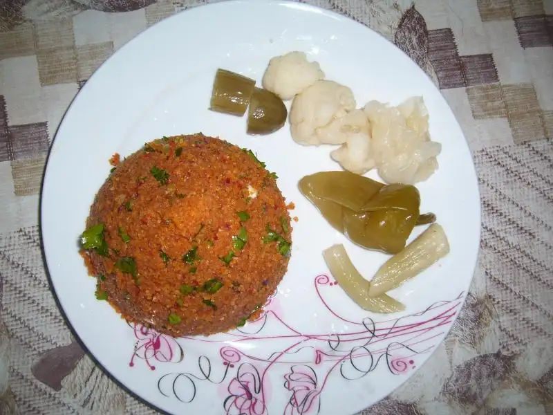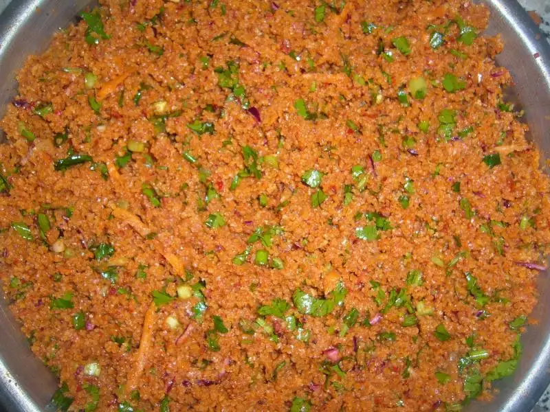 -Bulgur kaynayan su ile ıslatılır....Kaba bulgur konur,üzerine az geçecek kadar su eklenip kapağı kapatılır...10-15 dakika da bekledikten sonra baharat,tuz,salça,sumak ,yağ eklenerek yoğrulur...Yeşillikler ve sebzeler doğranıp eklenir üzerine tekrar yağ gezdirilir ve limon sıkılıp yoğrulur...Servis tabağına alınır.....Afiyet olsun..