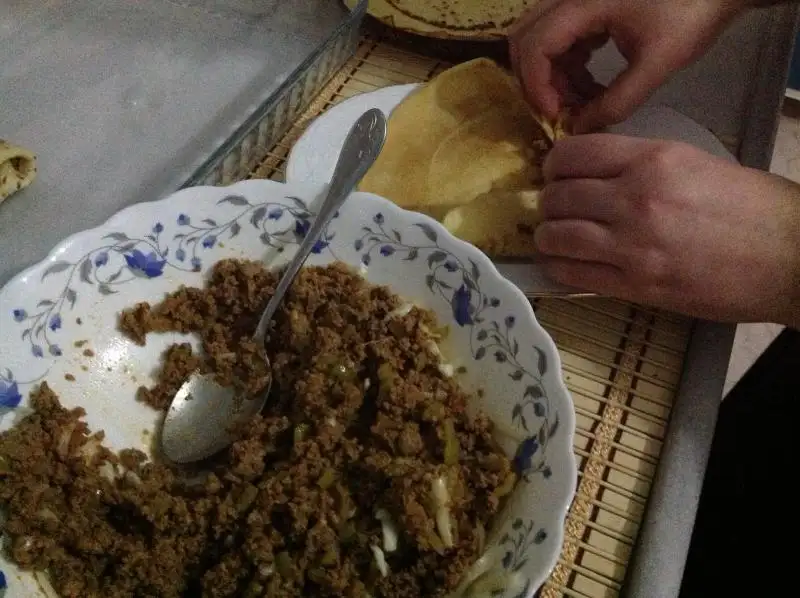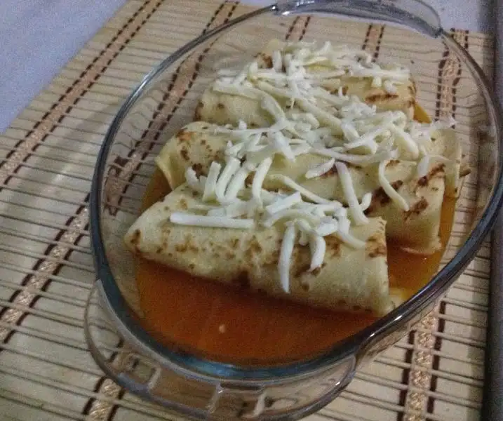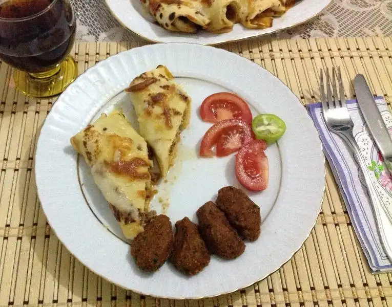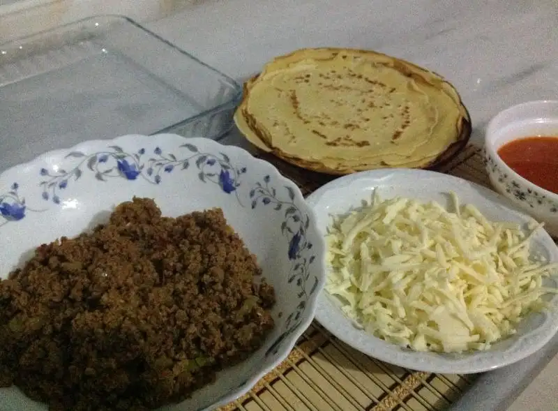 Kıymalı krep: Krep için tüm malzemeyi çırpın. Yapışmaz yüzeyli tavayı yağlayıp kepçe ile hamurdan alın ve tavaya yayın. Orta ateşte iki tarafı kızarıncaya kadar pişirin. Üst üste dizerek hamur bitinceye kadar aynı işlemi tekrarlayın. Soğanı küp şeklinde doğrayıp kıyma ile tavaya alın. Tereyağını ekleyin ve 5 dakika kavurun. Salçaları, ince doğranmış biberleri ve baharatları ekleyip karıştırın. Suyu ilave edin ve kısık ateşte 15-20 dakika pişirin. Karışımın suyunu süzgeç ile süzün. Kreplerin üzerine rendelenmiş kaşar peyniri serpiştirin ve kıymalı harcı içlerine paylaştırın. Rulo şeklinde sarıp fırın kabına dizin. Kıymalı harcın suyunu kreplerin yarısını geçecek kadar ekleyin. Üzerine rendelenmiş kaşar peyniri serpiştirip, 190 derece fırında peynir hafif kızarıncaya kadar pişirin. süsleyip servis yapın.