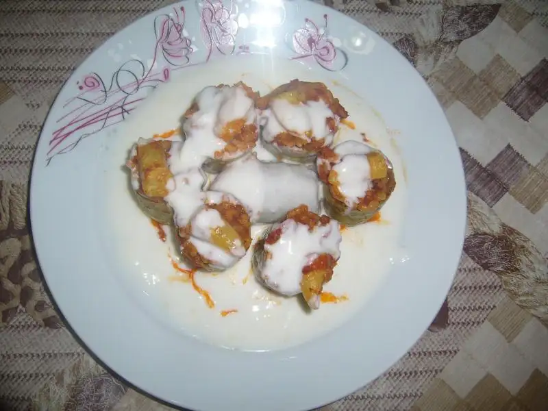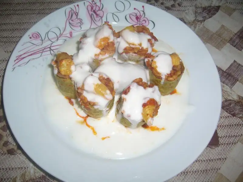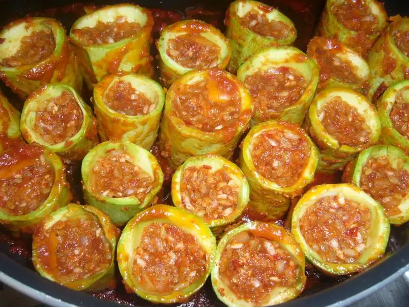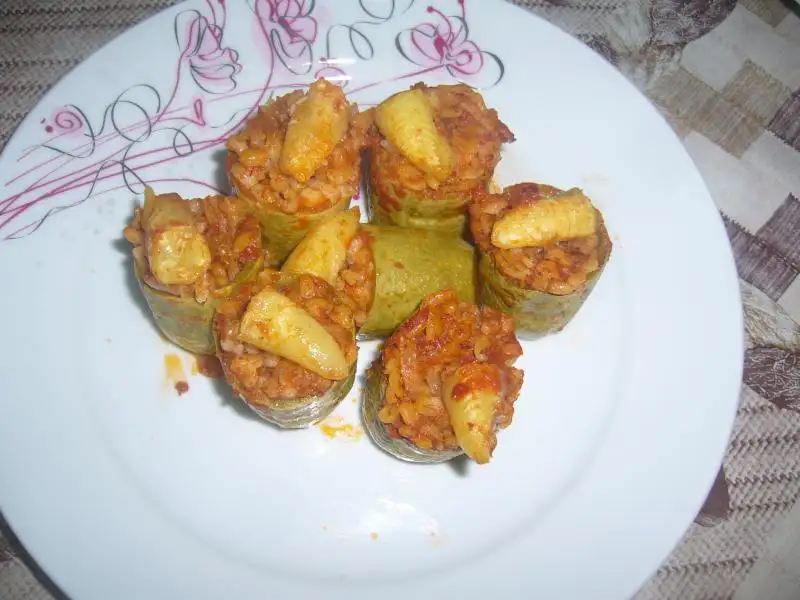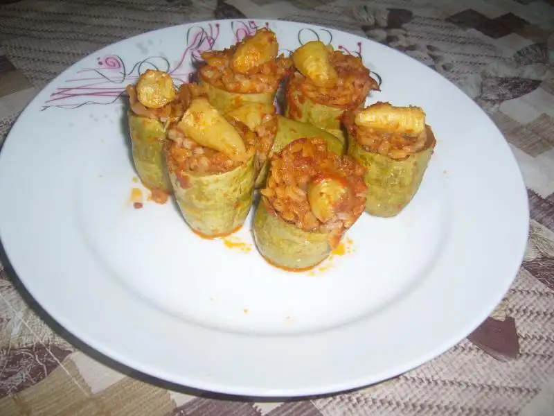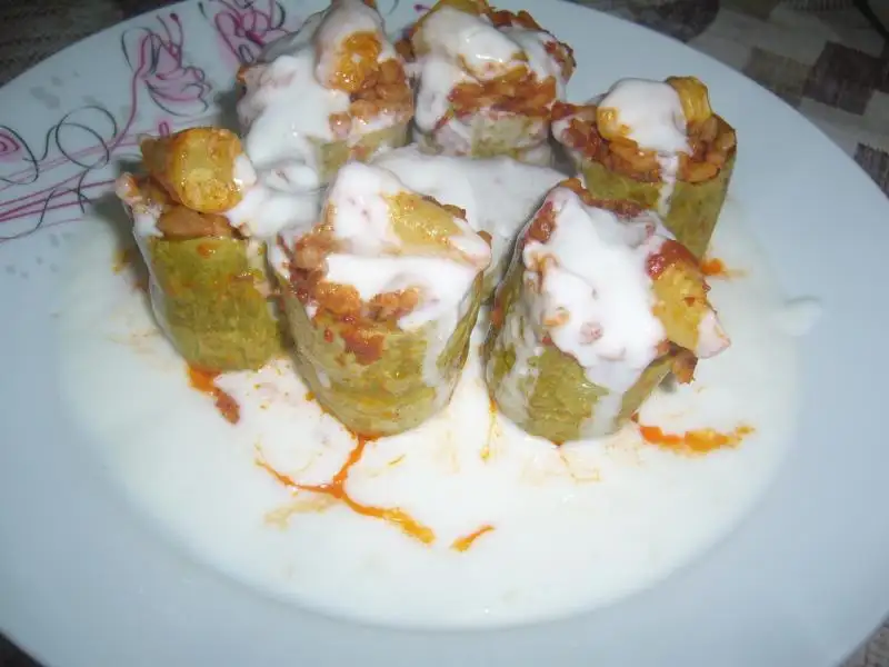 Kabaklar yıkanıp 3e bölünür ve içleri oyulur ...Tüm malzeme karıştırılarak yoğrulur..Sonra oyulmuş kabaklar hazırlanan içle doldurulur..Pişirilecek olan tencereye yağ konulur sonra 1 kaşık domates salçası eklenip kavrulur sonra kabaklar bu salçaya bulanarak tencereye dizilir..sonra üzerine su ilave edilerek pişirilir...Servis tabağına alınan kabakların üzerine sarmısaklı yoğurt dökülerek servis edilir..Afiyet olsun