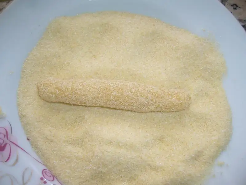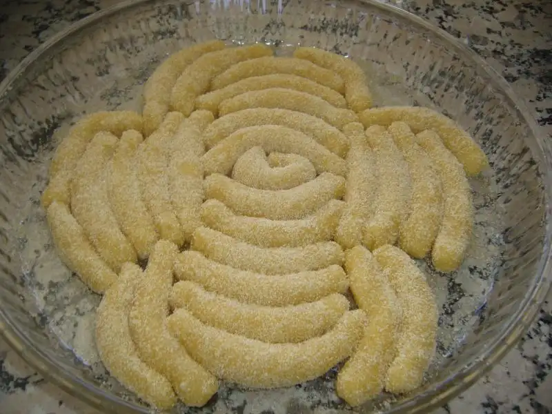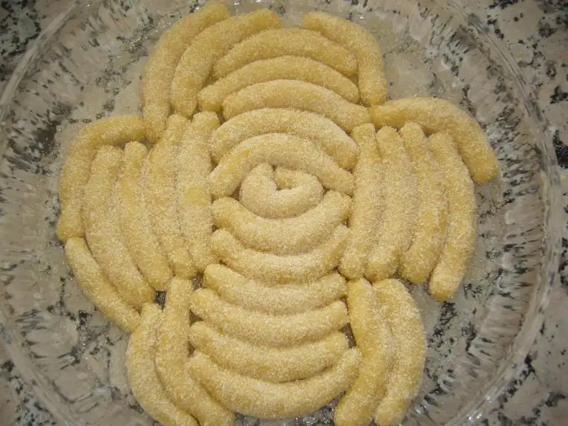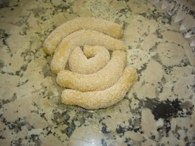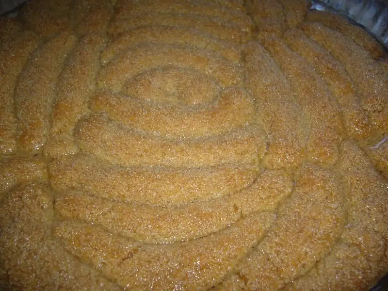 Tüm malzemeler karıştırılıp hamur yapılır...Sonra küçük bezeler alınıp rulo yapılır.irmiğe bulanıp yağlanmış borcama dizilir..Tüm hamur bitince 170 derece de pişirilir...Fırından çıkar çıkmaz şeker ve su karıştırılıp kaynatmadan üzerine dökülür ...AFİYET OLSUN..