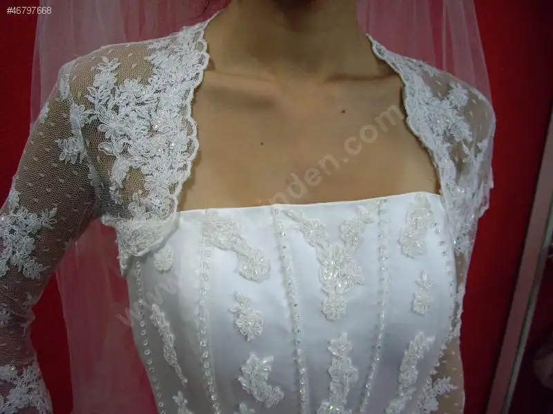 Gelinliğiniz vucudunuza oturmuş ve çok şık durmuş ama sanki gelınlıgı berbat etmek ıstermiş gb gıydırılen o bolero herseyı mahvetmiş .. bir kere gelinliğinz ağır kalıteli duruyor .. boyle bır gelınlıge saten duz bolero yerıne ince dantelli beloralar yakışır örneğin :