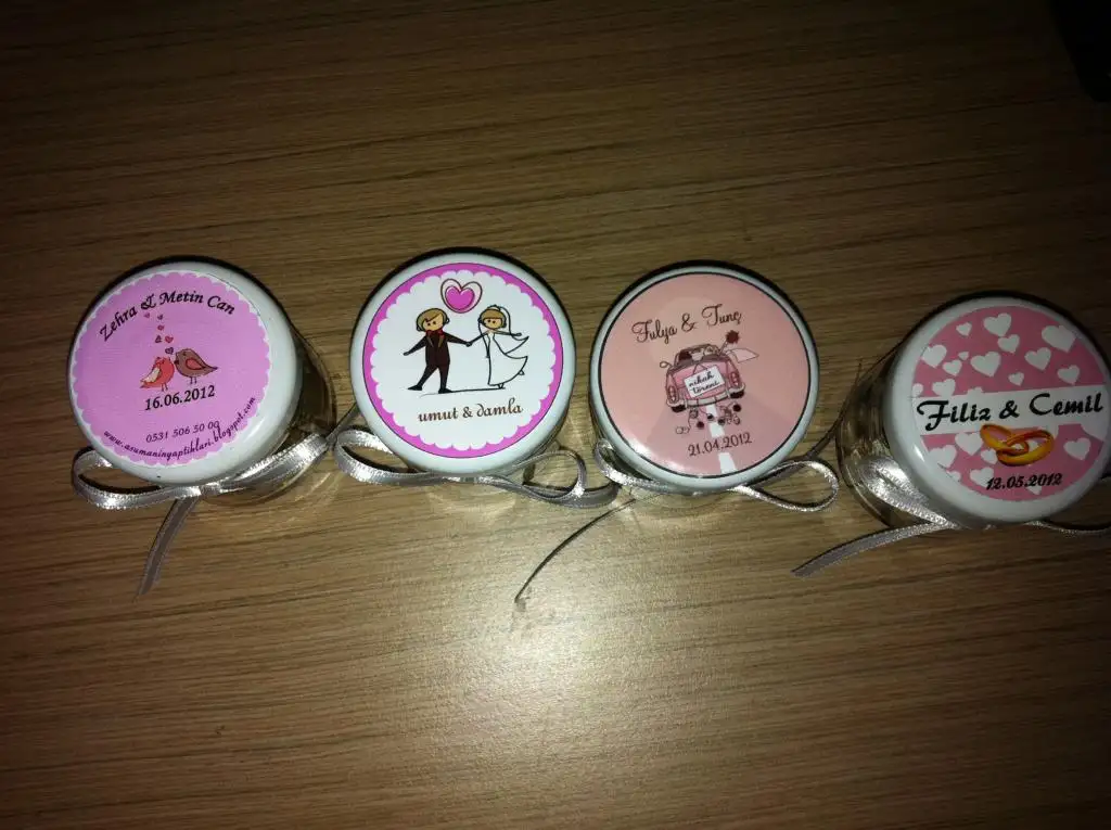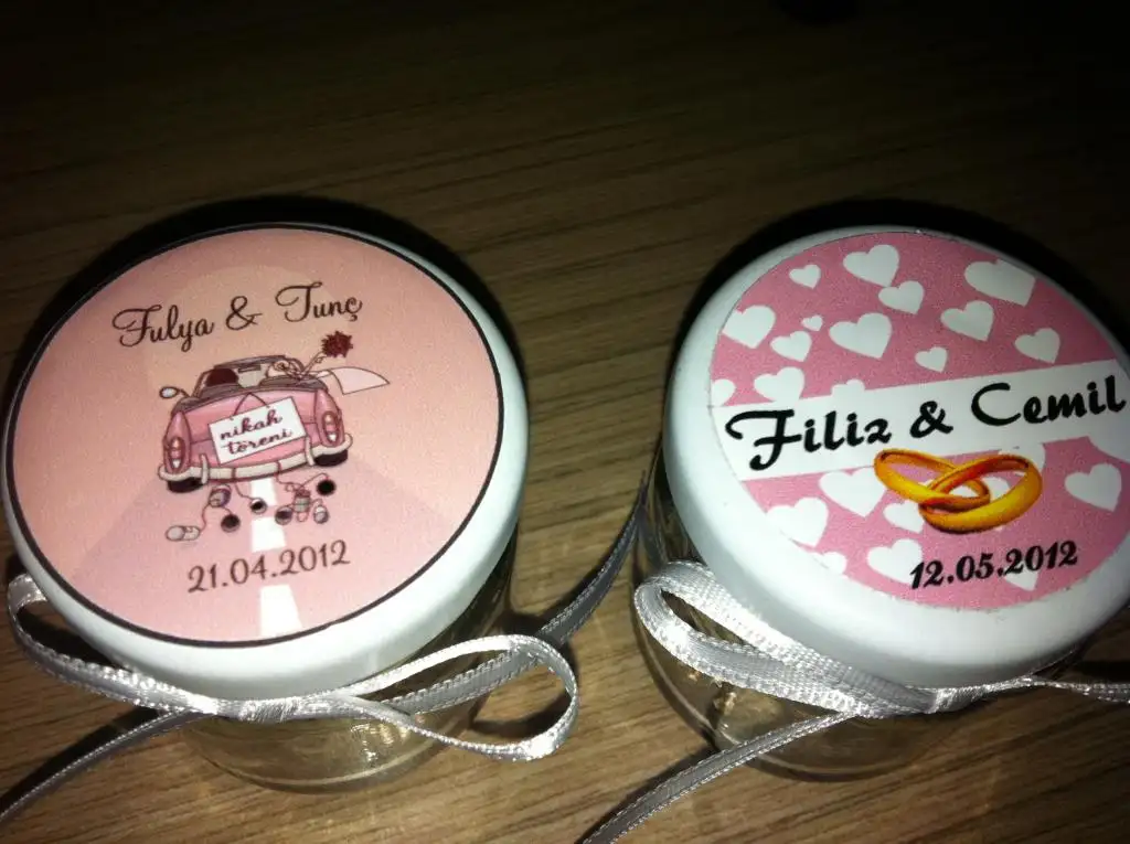 kızlar nikah şekerim için bi hesp yaptık 2 mılyara gelıyor? sonra çıktık emınonune arkadsımlakafamızda bır model kavanoz, şeker, kurdele,stıcker bitti hepsını ayarladık. 450 tane nıkah şekeri bıze 250 liraya mal oldu. eger dusunursenız ve yapmak ıstersennız matbbaa fılan hepsının bilgısını veririm. sadece suna karar veremedık. stıcker ikinci resimdeki gibi hem ön yüz hem de üst kapaktamı olsun? yoksa sadece kapakta mı olsun da içine badem şekerini tül ile sarıp mı koyalım burda yardım istiyorum