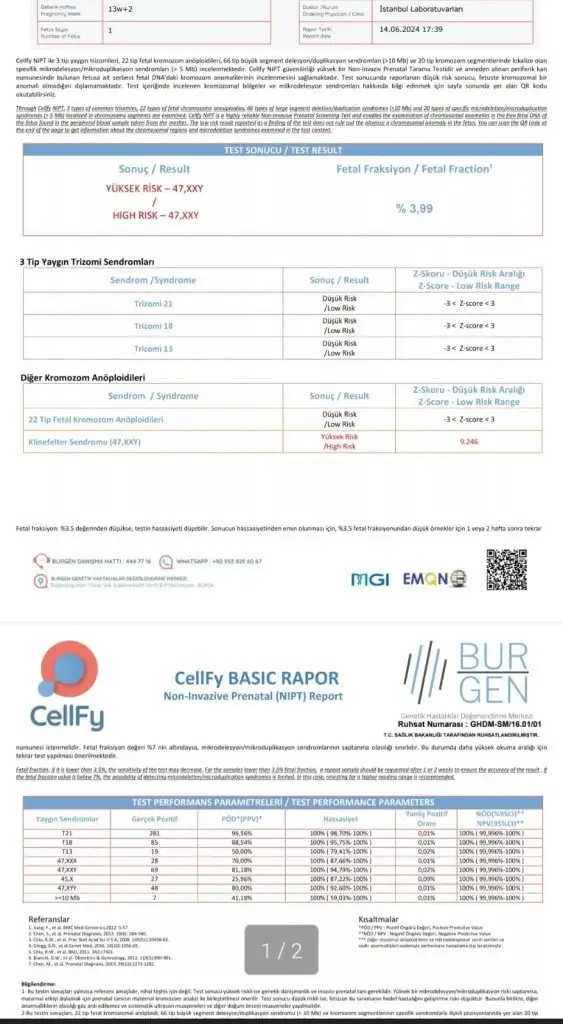 Trizomi kaç için yüksek risk gelmiş anlıyamadım ama fetal freksiyonunuz çok düşük muhtemelen test yanlış sonuç vermiş.Usg verileriniz nasıl pekiHerkese merhabalar.. açıkcası gözyaşları içinde okudum tüm mesajlarınızı. Yalnız değilim diye sevinirken, lütfen benim de sonucum yanlış olsun diye dua ettim bir yandan. Burgen Bursa firmasına 13. Hafta yaptırdığım testi sizlerle paylaşıyorum. Xxy olarak yüksek riskli çıktı. Yanındaki Z scoru değerinin ne anlama geldiğini asla anlamadım. Yorumlarınız çok kıymetli. 30 yaşında karı kocayız ve ilk çocuğumuz. Haftaya çarşamba 16. Haftaya giriş olacak ve amniyosentez yaptıracağım. Açıkcası test doğru ise ne yapacağımı bilmiyorum sadece testin yanlış olmasına dua ediyorum.Eki Görüntüle 3441639
