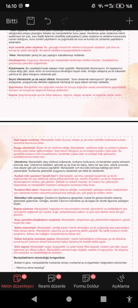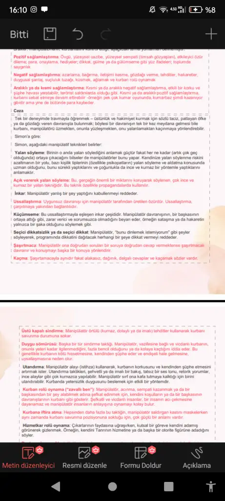 Beni bitiyor gerçekten bitireninde ben olmamı istiyor ve senin tercih ve isteklerinden dolayı bitiyor diyo ben ne istedim ben böyle olsun istermiyim sabır edememişim idare edememişim ama hangi birini idare edeyim idare ile ömür mu geçer vicdanım çok sızlıyor gerçekten. Böyle olursa ben evlenince mutlu olacağımı sanmıyorum dedim onu söylüyor sürekli zaten mutlu olmuycakmissin sen karar ver ne istersen o olsun sen nasil mutlu olursan öyle olsun diye benim mutluluğum için değil mantıkli olan bı körü körüne gidersek şimdi değilse evlenince olucak ayrılık diyorum ama karşımdaki beni hiç anlamıyo kiAyrıca nişanlın seni manipüle ediyor senin vicdanına oynuyor. Senin suçun yok saçmalama bin lira on bin lira olsun kimse bunun lafını yapamaz. Sabretmek ney ya sen git aileni sustur. Bak herşey yanindaki erkeğin elinde aslında. Senin gibi kızı bulmuş sömüyor net. Duygu sömürüsü bu manipülasyonn. Lütfen ekte gönderdiğim resimlere bak. Bunlar manipülasyon taktiği