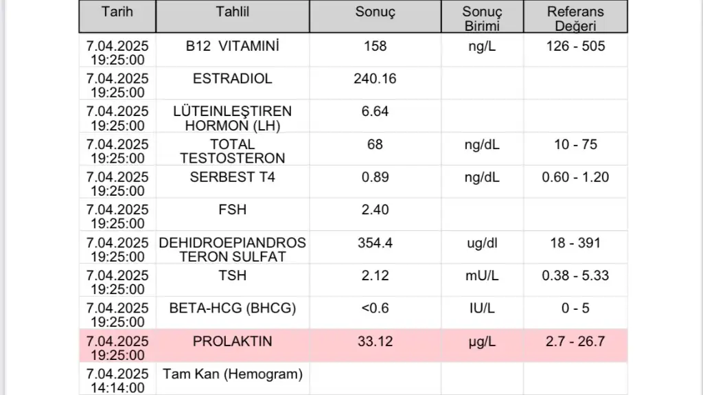 Bu test adetliyken mi yapıldı peki ? Reglin 2 ya da 3. Günü yaptırılması lazım. Bi de prolaktinin yüksek çıkmış niye ilaç vermediBir tane yaptırdım koyarım buraya ilaç vs vermedi bir 10 gün sonra tekrar gidip yaptıracağım