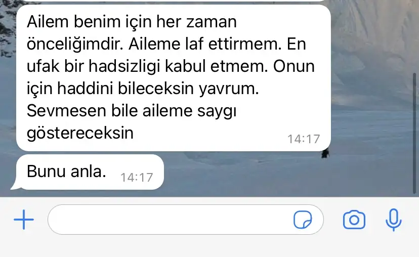 Nişanlımın ablası nişana bile gelmedi , onu geçtim nikah kıyılacak daha benimle bile tanışmadı , sonra bende bugün ablasının çok garip olduğunu söyledim , benimle tanışmadı garip dedim diye bana yazdığına bakın , cidden normal mi yani nikah kıyılacak ve hala bi tanışma zahmetinde bulunmuyor . Neymiş ailesi çok değerliymiş sanki bizim ailemiz değerli değil , siz olsaydınız ne yapardınız