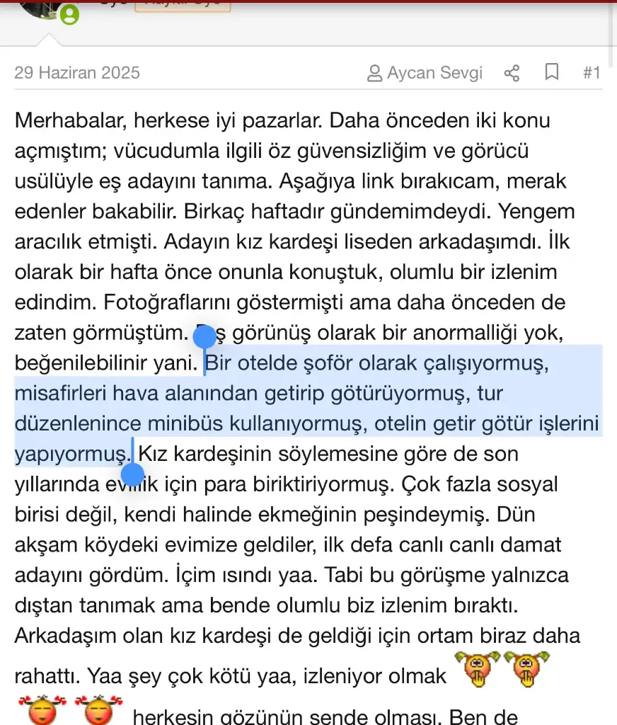 Uyarınız için teşekkürler. Daha dikkatli olurum.Üstüme vazife değil ama, minik bir tavsiye: İş arkadaşlarınla o muhabbetlere çok girme aranızdaki sınır açısından da problem olur, o ona o ötekine anlatır en kötü buraları okuyan varsa aa bu bizim filanca diyip ifşa olursun birbirlerine anlatırlar nişanlına kadar gider bir şekilde.