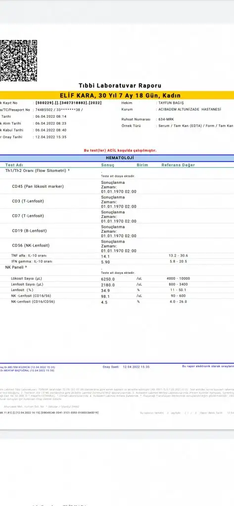 Merhaba arkadaşlar benim 6. Tup bebek başlanacak öncekilerde 3 düşüğüm 2 negatif var doktorum nk hücre panel testi ve th1 th2 oranı için kan testi istedi verdik 1 haftada cıktı sonuç ama doktora gitmeme daha çok var ve merak ediyorum acaba bu testlerden yaptırıp benim testimide yorumlayabilecek olan varmi şimdiden çok teskkurler