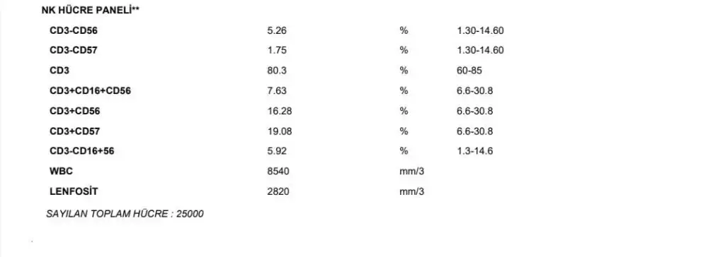 Nk paneli sanırım testin genel adı içeriğinde cd56 ve diğer testlerde oluyor yani sizde de bakılmış hepsine sanırım çok sorun gözükmüyor aralıkta gibi hepsi de çok geçmiş olsun