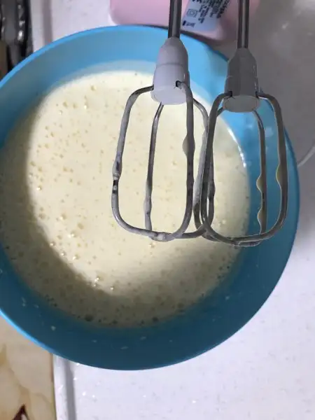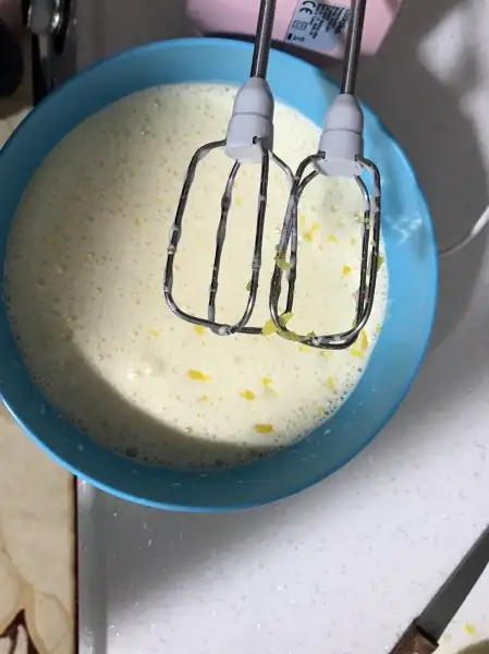 Yumurta ve şekerim mayonez kıvamına gelene kadar yaklaşık 5dk en yüksek devirde çırpıyoruz