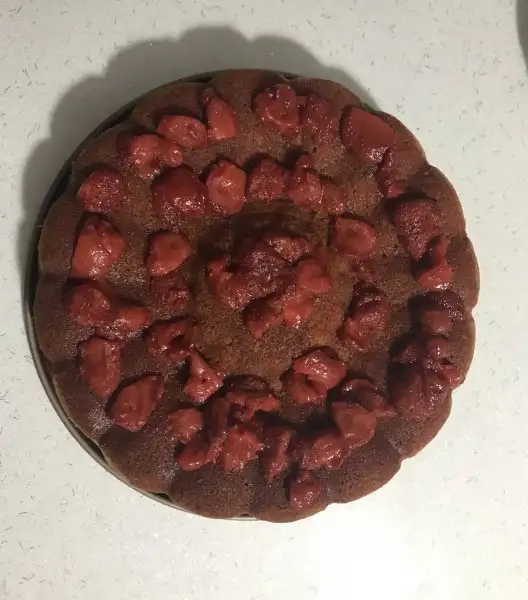 Kek piştikten sonra sıcakken üzerine önce sosu gezdiriyoruz sonra çilekleri koyuyoruz