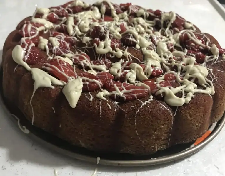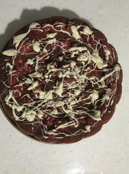 Çikolatayı benmari usulü eritip çilekli kekin üzerine şekil yapıyoruz. Afiyet olsun :)