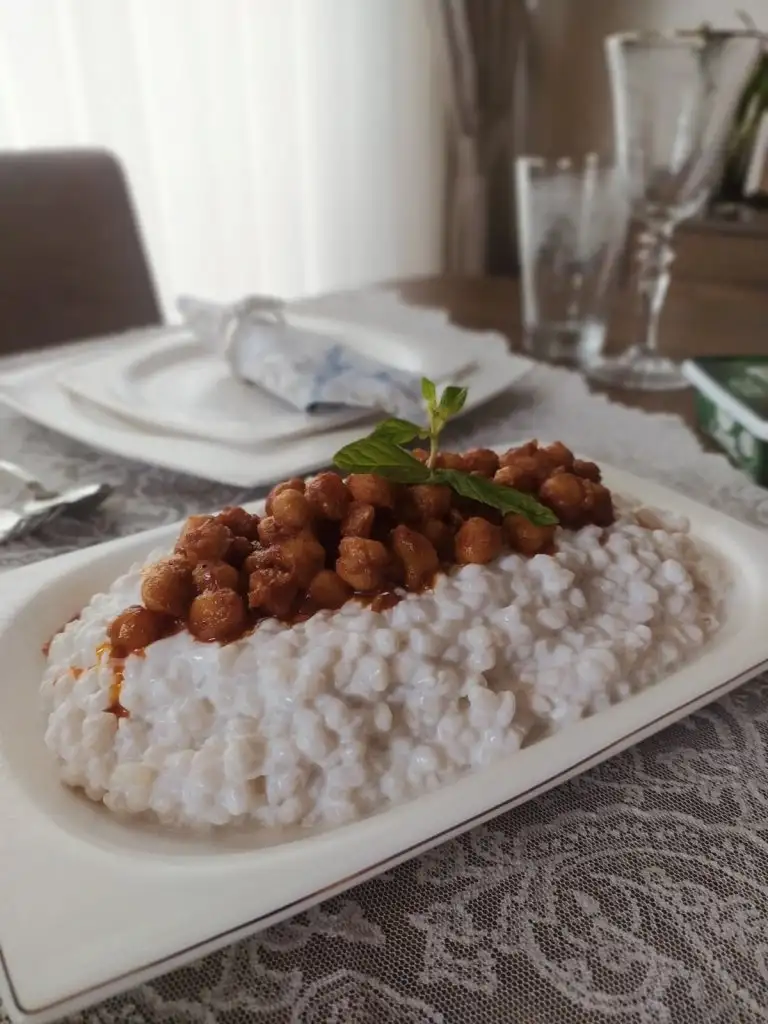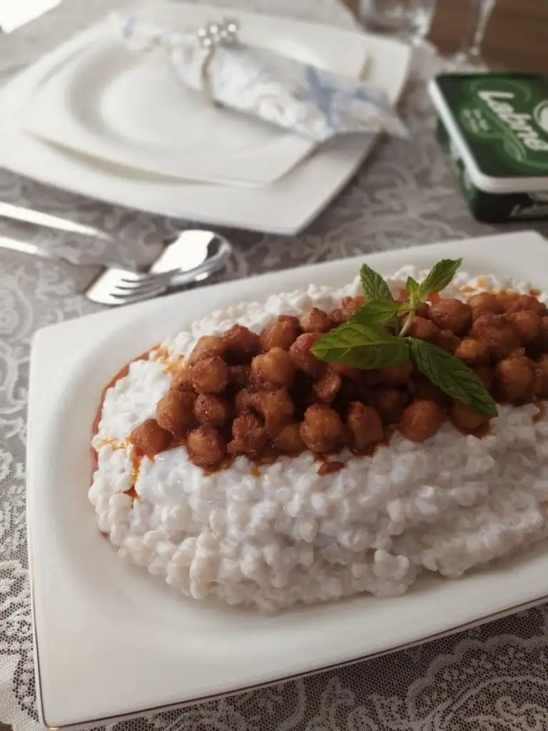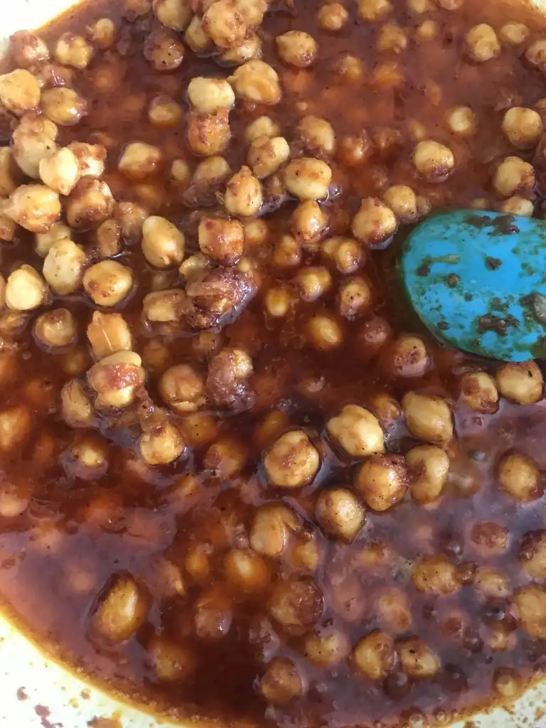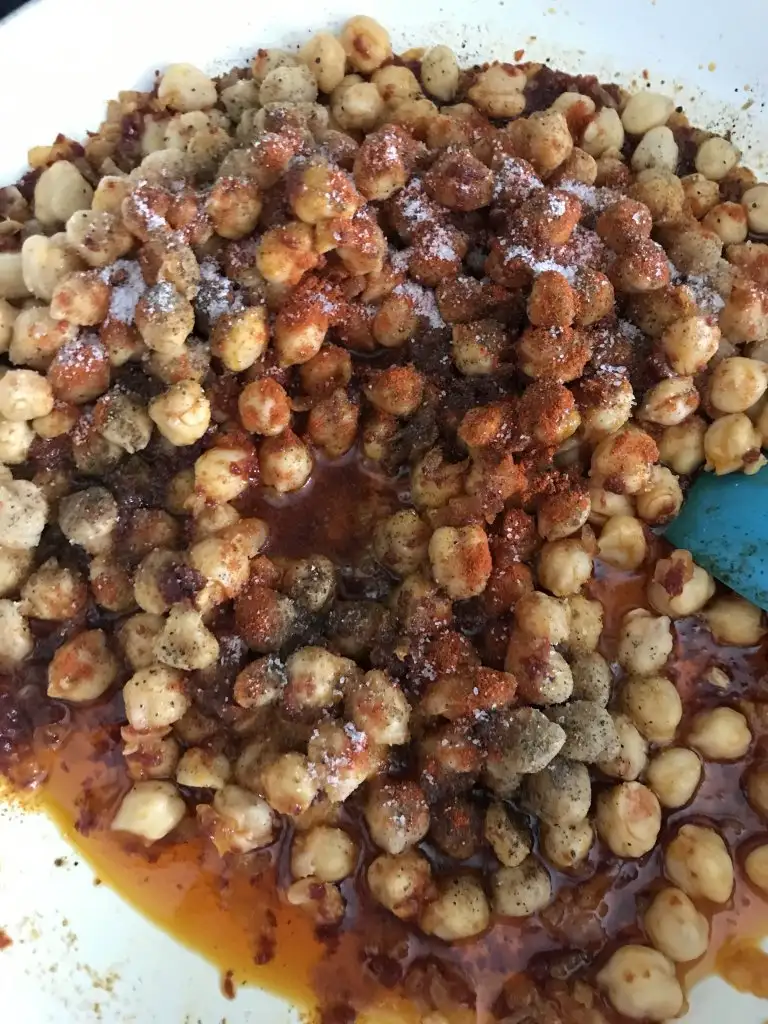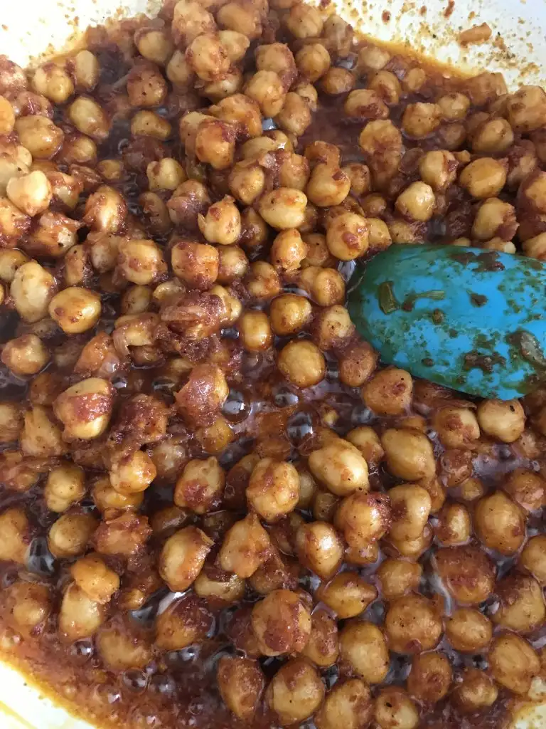 Üzeri için soğanları ince ince doğruyoruz. Zeytinyağında soteliyoruz. Salçayı ekleyip kavurmaya devam ediyoruz. Önce nohutu, sonra da baharatları ekliyoruz. Biraz karıştırdıktan sonra bir bardak suyu da ekleyip çekene kadar pişiriyoruz. Soğuduktan sonra servis edebiliriz.