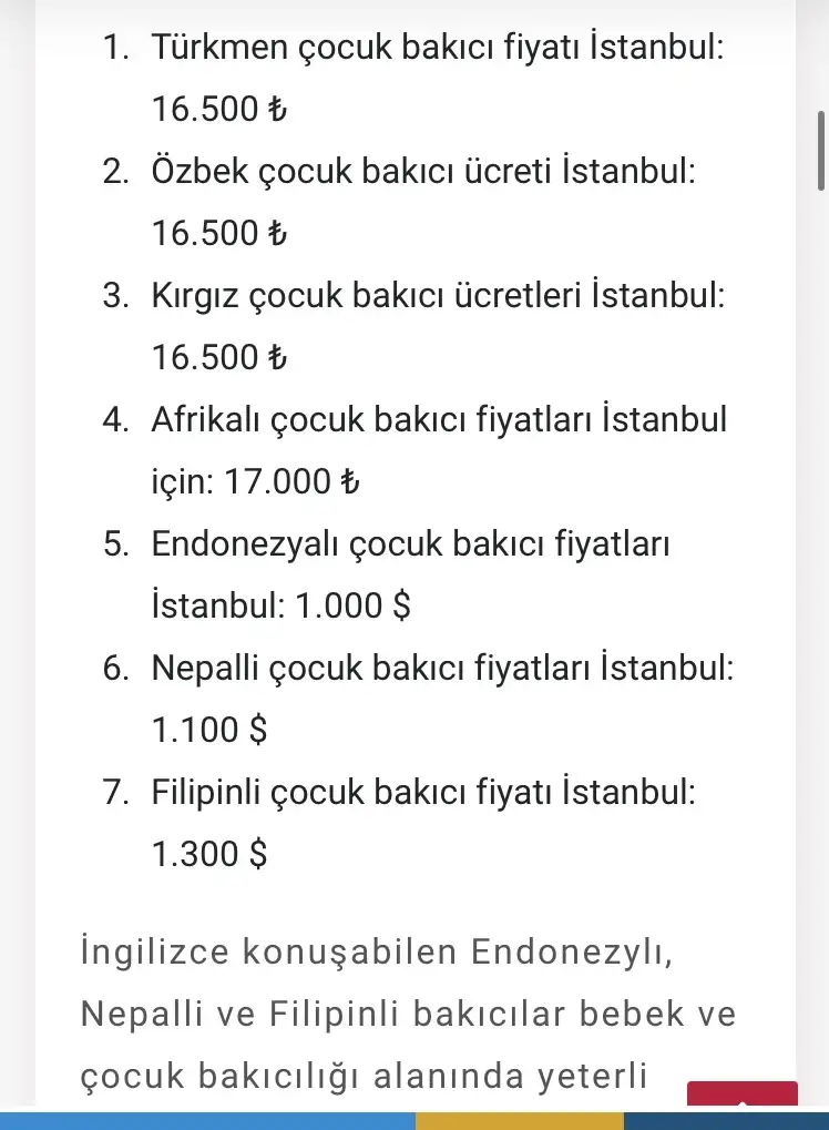 Kırgız, özbek, türkmen..vs uyrukluların piyasası bu değil. İngilizce biliyor ise Filipinli, endonezyalı, nepalli onlar bu fiyatları istiyor. Siz kendiniz ilan verip, kendiniz görüşün bence. Hangi şehirde yaşıyorsunuz bilmiyorum bulunduğunuz şehrin facebook iş ilanlarına ilan verin. Ben Antalya’da yaşıyorum. Okul öncesi eğitimi almış, kreş şartlarını ağır bulan pek çok çıtı pıtı genç kız başvurmuştu. Benim evim küçük olduğu için ben gündüzlü istedim. Ama gidecek yeri olmayanlar da yatılı tercih ediyor. Hem yaşadıkları evde masrafları da çıkmadığı için para biriktirebiliyorlar.