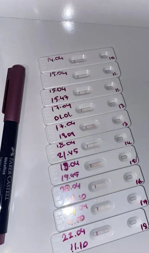 Merhaba kızlar, ben de ovulasyon testi kullanmaya başladım fakat emin olamadım hangi gün çatlama olduğunu ya da olup olmadığını bakabilir misiniz? Bugün 18.gün adet olduğumun, devam etmeli miyim?