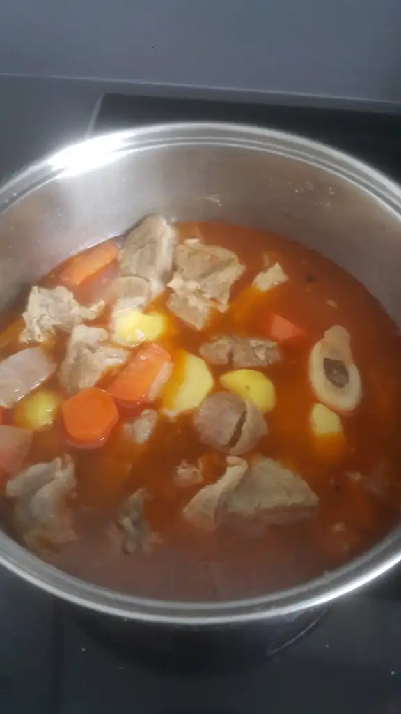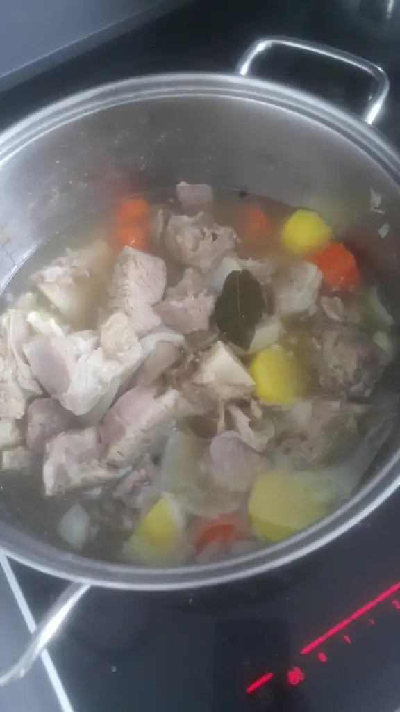 Canım önden etleri pişirip üzerine sebzelerini defne yaprağını ve tane karabiberi koyup sebzeler pişene kadar tekrar pişiriyorum.Terbiyesini ben biraz sıvı yağ bir kaşık tereyağ ile 1buçuk kaşık unu kavurup haşlamanın suyuyla karıştırarak yapıyorum hatta terbiyesine kırmızı toz biber de koyuyorum.haşlamanın rengi de güzel oluyor o şekilde.Sonra yarım limonu sıkıp iki diş sarımsağı rendeleyip servis ediyorum.bu fotodakinin daha terbiyesi yok patatesler pişince yapacağım inş.
