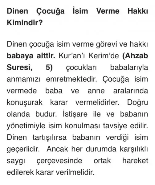 Böyle bisey yok canim.azhap suresinde geçen ayetlerde çocuklari babalarinin ismiyle cağirin diye yazar.kuranda babasi ismini koyar demiyor.bu hak anaya ve babaya verilmistir.:) Naz yapabilirsin tabi hakkındır. Dinimiz isim babanın hakkıdır diyor ama :) onu napcan