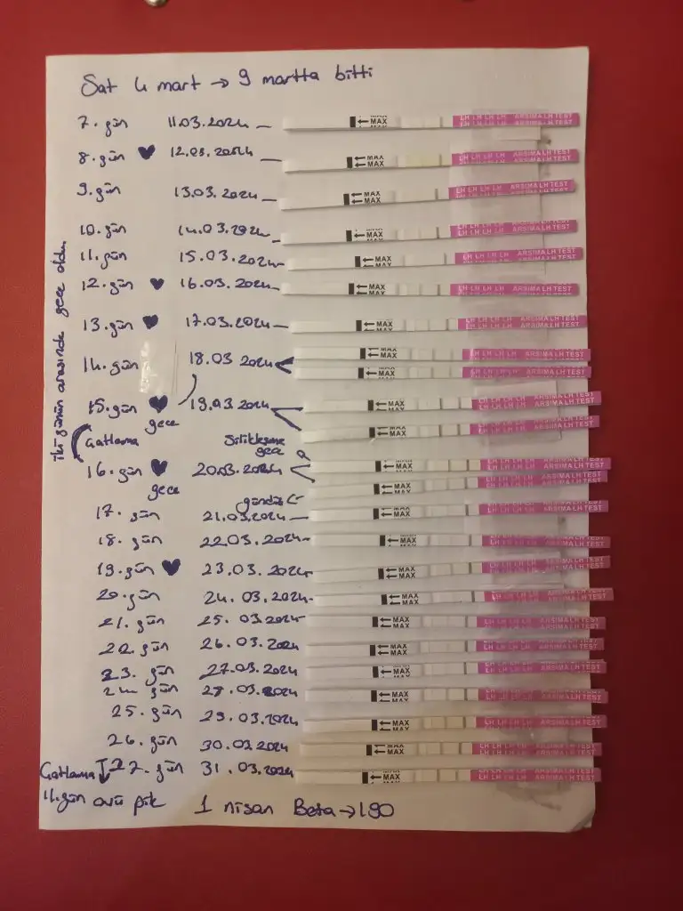 Çatlamadan 9. sonra ovülasyon testi koyulaşmaya başladı. 11. gün tekrar pik yaptı. Kaset testlerde ince çizgiler çıktı. Erken gebelik testlerinde daha belirgin çizgi çıktı. Gün gün koyulaşmayı takip ettim. 12. gün kan testi verdim ve hamileydim.