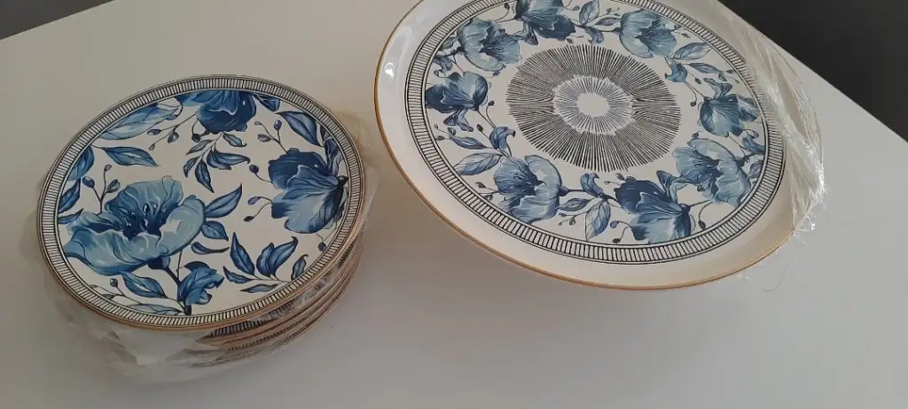 Hediyem yazın deniz kenarında kurulan Alaçatı sofralarından çıkmışçasına maviş, çiçekli, muhteşem bir pasta takımı