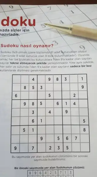 Bulmacanın zorluk derecesine göre ipuçları verilir. Her sırada ve kendi içinde bölünmüştür ve her dokuz karelik bölümde aynı rakamdan sadece bir tane olabilir. Sudoku uzmanları, oyunun sadece mantık yürüterek oynanacağını, bu yüzden de en çok Avrupa’da Sudoku çılgınlığı, Amerika’yı kasıp kavurmaktadır ve oynayan sayısı her geçen gün artmaktadır. Sudoku zekâ gücünü geliştirici entelektüel bir rakam bilmece türü. Otobüste, trende, öğlen aralarında, tenefüslerde rahatlıkla oynanabilecek bir oyun.