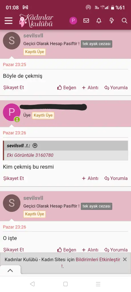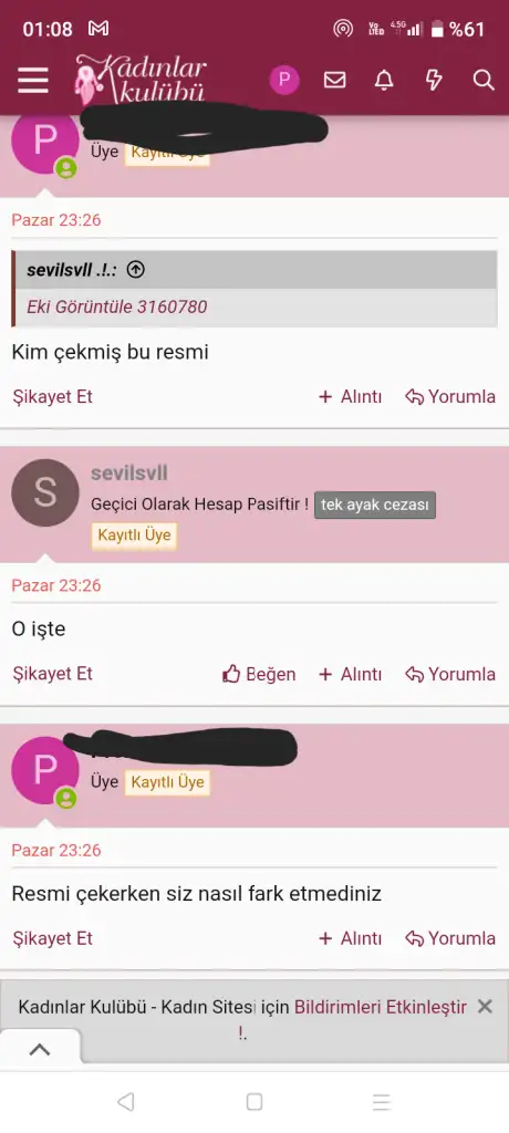 Bir ara böyle benzer bir konu vardı, ben o konuya yorum yapmıştım, sonra ne alakaysa o konuya yorum yapan başka birisi (pembe profil resimli) bana mesaj attı, konu sahibi oğluyla ilgili bana böyle böyle mesajlar attı diye. Oğlum sapık resimlerimi çekiyor, bana ilgisi var vs diye mesajlar atmış alakasız kişilere. Attığı bu üye de safça cevap vermiş 😂 Screenshotları da bana yolladı, neden bilmiyorum, sonra da "beni de erkek zannediyorlar ama istersen kanıtlayabilirim" filan dedi, birlikte mi çalışıyorlar anlamadım, epey kafam karışmıştı. Emin değilim tabii, o yüzden nickini karaladım. Bu da böyle bir kk anısı...