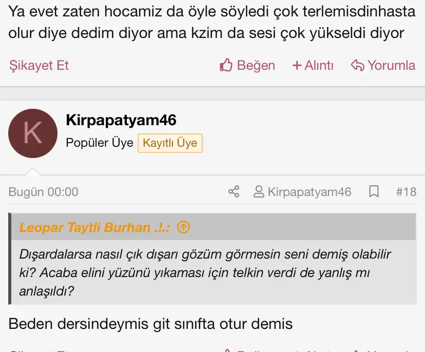Yani beden dersi bir de terleyecek elbet ve kimse kızmasın ama öğretmen de "aman X çok terlemiş anası kadar endişeleneyim kızayım" demez. Tutarlı gelmiyor anlatılanlar öğretmen bir şeye sinirlenip kızınıza patlamış olabilir sonradan toparlayamamıştır durumu