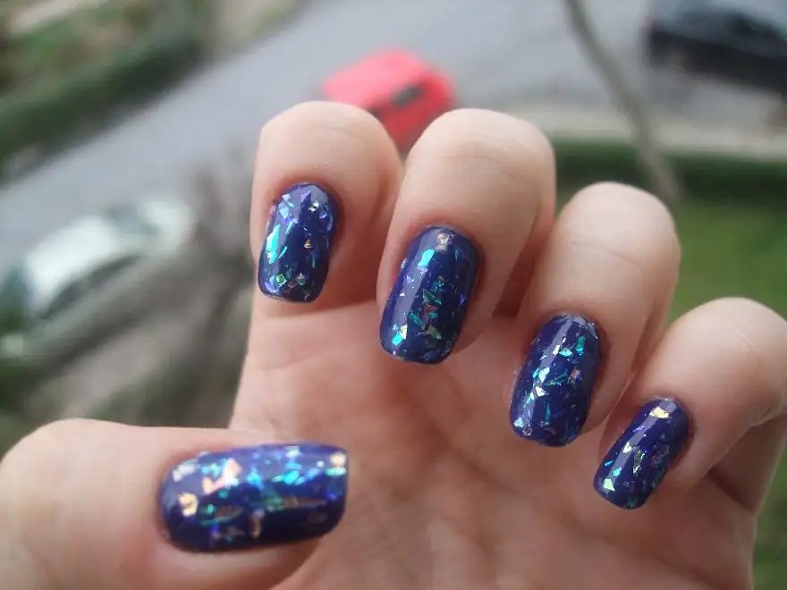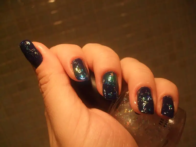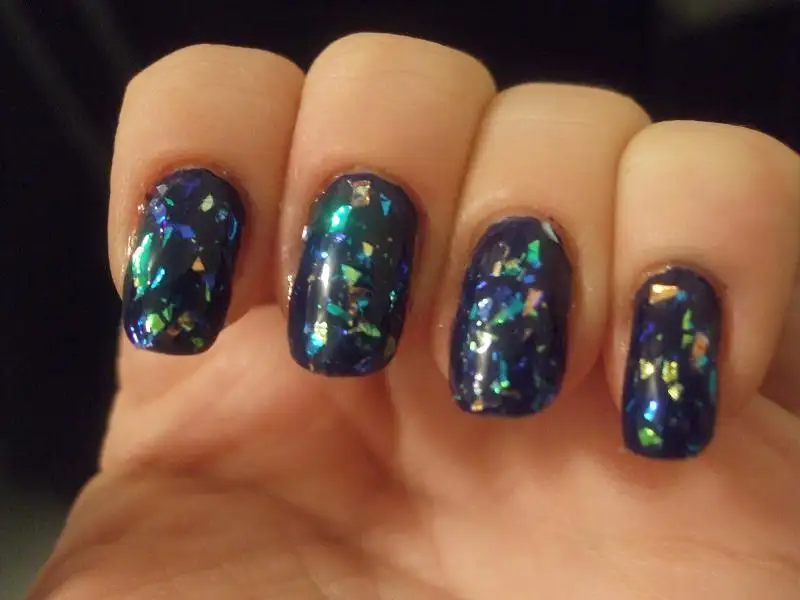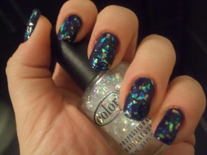 Aslında çıplak haliyle bırakacaktım fakat sonradan aklıma şeffaf ve rastgele şekillerden oluşan irili ufaklı pulların koyu mavi ve lacivert tonları üzerinde ne kadar muhteşem durduğu geldi. Hemen Color Club 902'yi çıkarıp bir kat sürdüm. (902, nam-ı diğer "Covered in Diamonds" :) ) Bu tür şekilsiz pullar tırnakta olağanüstü güzel dururlar ama bir dezavantajı vardır, üzerinden top coat geçmezseniz elinizi yüzünüze götürdüğünüzde yüzünüzü çizebilirsiniz, ve tırnaklarınız saçlarınıza takılır, daha önce başıma geldiği için iyi biliyorum; ki zaten uzun zamandır top coatsız bırakmıyorum hiçbir manikürümü... Bu defa iki kat top coat geçtim üzerinden... Bazen çok iri pullarda top coat da yetmez, o zaman törpüyü tırnak yüzeyine paralel tutarak (ama asla bastırmadan) çok hafifçe törpülerseniz tırnak yüzeyi pürüzsüz hale gelir ama bunu dikkatli yapmalısınız, ojenizi bozmadan sadece pulların çıkıntılarını törpüleyeceksiniz, quick dry kullandıktan sonra bile en erken yarım saat sonra yapmanızı öneririm.