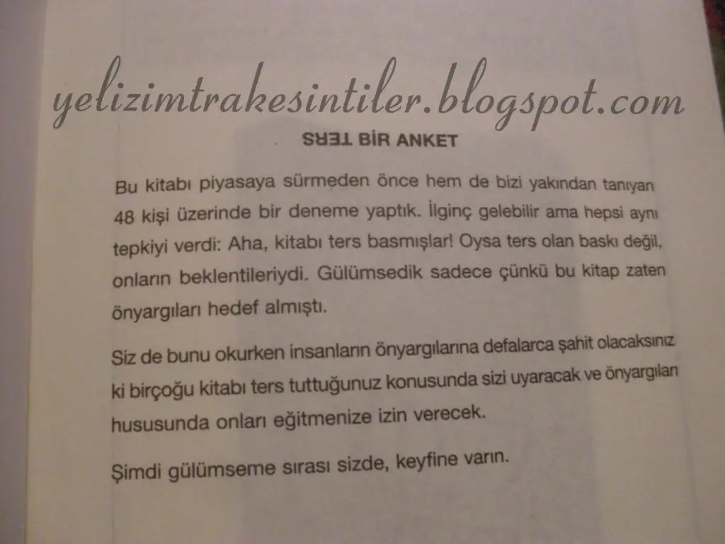 Kitabı açtıgınız anda sizi karşılayan ufak bir yazı var düz olarak :) ama arka sayfalarda yazılar hep ters :)))