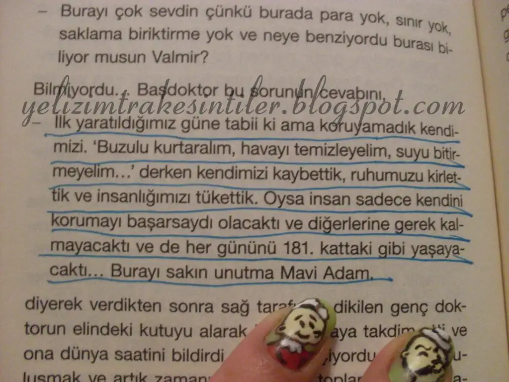 :))) teşekkür ederimmmm :)) kitabın konusuyla ilgili bişey yazmadım çünkü gizemini bozmak istemedim ama çok kısa bir şey söyliyeyim bir gün uyanıyorsunuz banyoya gittiginizde saçlarınızda dahil renginizin maviye dönüştügünü görüyorsunuz ve olaylar gelişiyorrr :)))