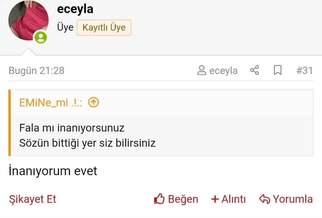 Yoo mesajlarınızda inanıyorum dediniz. Ekte foto olarak koydum mesajınızı. Zaten fala inanıyorum dediğiniz andan itibaren sonra yapacak bir şey de yok söylenecek bir şey de.Falcıya inanmiyorum hayatımda da 2 kere gittim