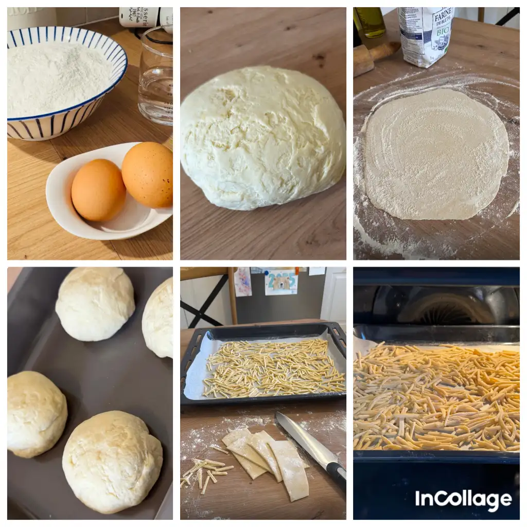 Erişte için 500 gram un, 2 yumurta bi tatlı kaşığı tuz ve 150 gram su malzemeler. Hepsini karıştırıp, yoğurup bezelere ayırdım. 15 dk. bekletip açtım. Sonra da kesmeye başladım sabahlar olmasın deyip. 100 derece fırında 15 dakka kuruttum. Sonra içime sinmedi birazda çarşafa serip 2 gün beklettim.