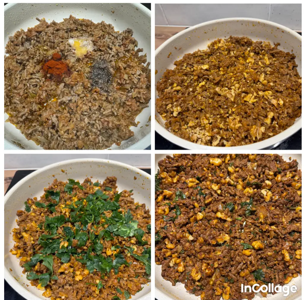 Bundan sonrası zaten kolaymıştı. Bildiğin yurdumun soğanlı salçalı kıyma kavurması. 200 gram kıymayı soğanla kavurdum. 1 yemek kaşığı salça, tuz, karabiber, toz kırmızı biber, onları da ekledim. 8-10 dal maydonoz kıyıp , 10 tam cevizi de rondo da çekip ekledim. Karıştırıp kapadım.