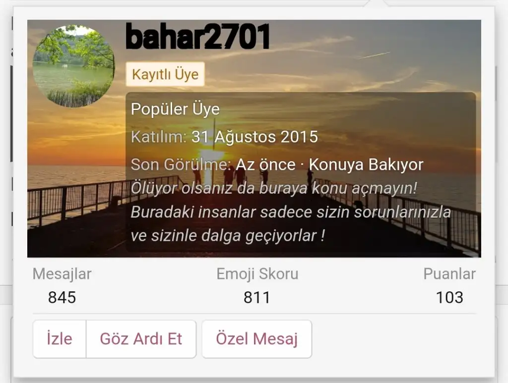 Benim gibi sinirlerine ve hırslarına hakim olamayıp, sert yazan oluyor ama bence de çok güzel tavsiyeler veriliyor.çok sevecen yazan arkadaşlar da var. Sert tepki verilen konular da gerçekten aldığı tepkiyi hak ediyor.maşllah o konuları açanlar da milletin altında paspas olmuş, millet sinirlenip, uyandırmaya çalışınca da suçlu oluyor.gücü bize yetiyor onların da.buradaki yoruma alınan kadın, hayatında neler neler yaşıyor.buradaki tepkiyi kaldıramıyor.garip.sertse sert.yetişkin kişiler biraz da sağlam duracak.küçük çocuk gibi herkes canım cicim yapmak zorunda değilMerhaba dertli arkadaşlar! Sakin ama sakın buraya konu açmayın daha sınırlı ve çaresiz bir şekilde ayrılırsiniz! Buradaki kadınlar inanılmaz akıllı başarılı mükemmel insanlar!. O nedenle bizim dertlerimiz ve sorunlarımız onlar için sadece utanç kaynağı çünkü onlarin soyları saray eşrafından. Lütfen değerli kardeşlerim gidip derdinizi bir kağıda yazın ve yakın buraya yazmayın!