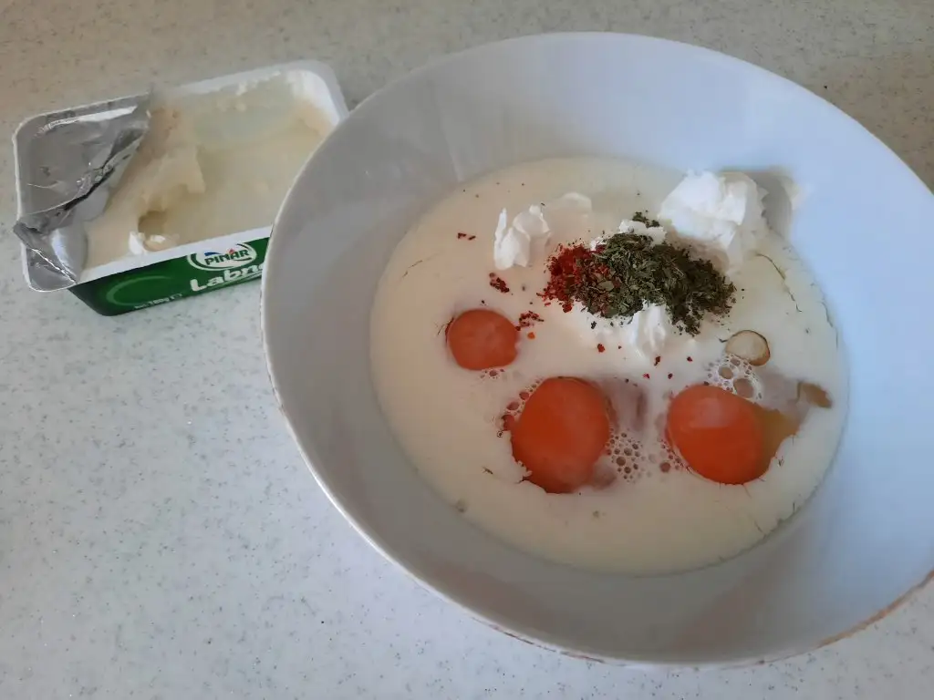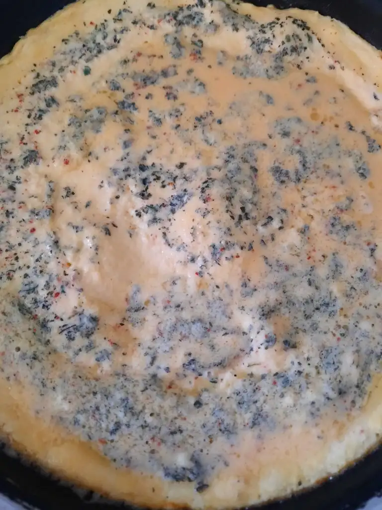 Bir kaba bütün malzemeyi koyup çırpıyoruz.tereyağını tavada eritip karıştırdığımız harcı tavaya döküyoruz.içi çiğ kalmasın diye kısık ateşte,üzerine bir kapak kapatarak pişiriyoruz.sulu kısmı kalmayınca bir tabak yardımıyla ters düz edip 5 dakika daha pişiriyoruz.omletimiz hazııırrr