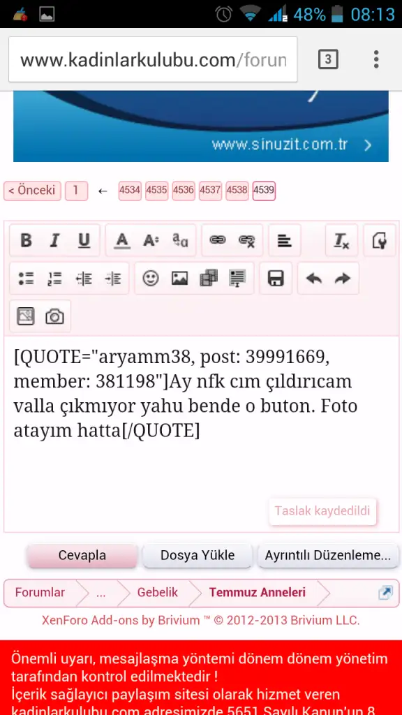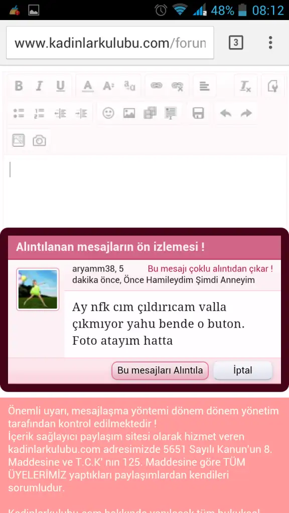 bu mesajı yazarken herhangi bi mesajın altındaki 'çoklu alıntı' butonuna tıklamadın di mi?Ay nfk cım çıldırıcam valla çıkmıyor yahu bende o buton. Foto atayım hatta