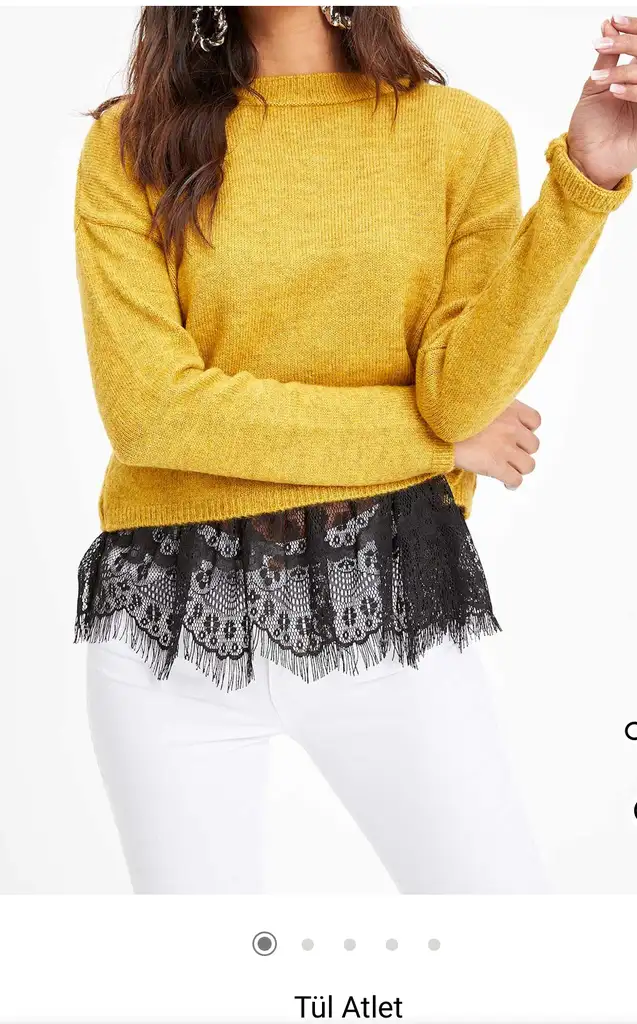 Görsel bi tarafa ürün açıklamasında net olarak “triko kazak” yazıyor ve görselde de alt kısmı dantelli sarı renkli bir triko olduğu anlaşılıyor siz yüzde yüz haklısınız.