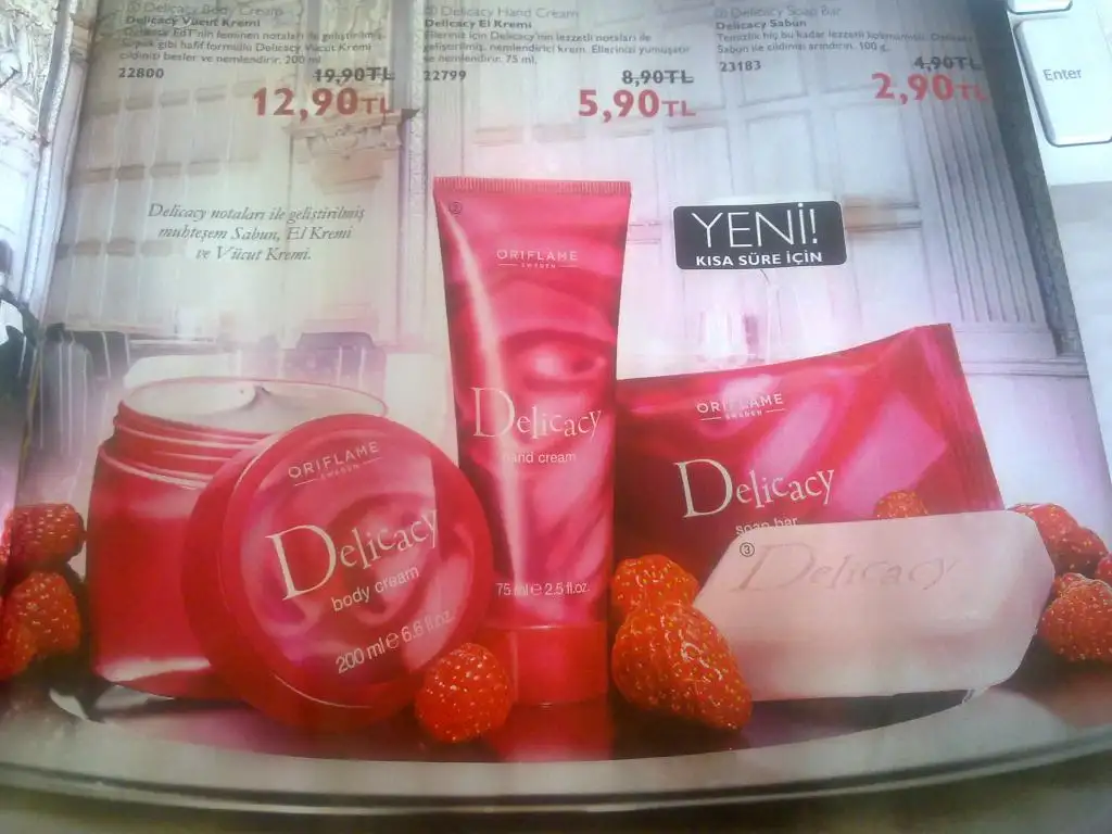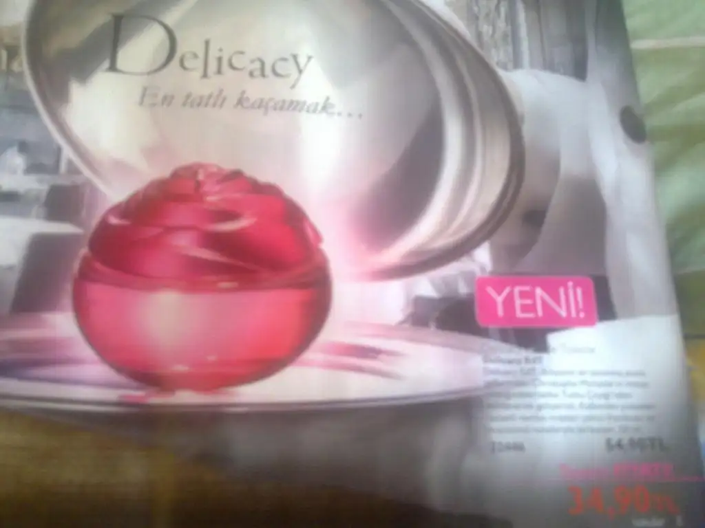 delicacy diye yeni bir parfüm çıkarmışlar arkadaşlar 17. katalogda çok güzel şişesi var kapağı gül goncası gibi görüntü olarak dkny be delicious parfümüne benziyor kokusunu katalogda bileğime sürerek alamadım ne yazık ki ama vanılyalı falan olduğu yazıyor 17. katalogdan soruları olan arkadaşlara yardımcı olabilirim
