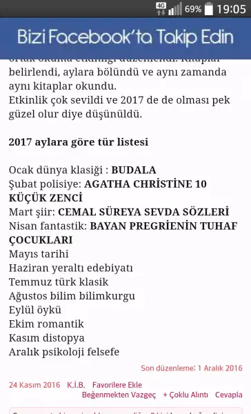 Himm anladım ben de sizinle birlikte aynı kitapları okuyayim o halde. Teşekkürler..Şimdi biz ocak şubat mart ve nisan ayı için ortak okunacak kitapları belirledik. Katılmak istersen bizimle beraber ilk sayfada belirtildiği üzere o aylardaki kitapları okumalısın. Ama diyelim polisiye ayında seçtiğimiz kitabı zaten önceden okumuş isen o ay başka polisiye okursun. Diğer ayların kitap belirlemesinde de yer alırsın istersen
