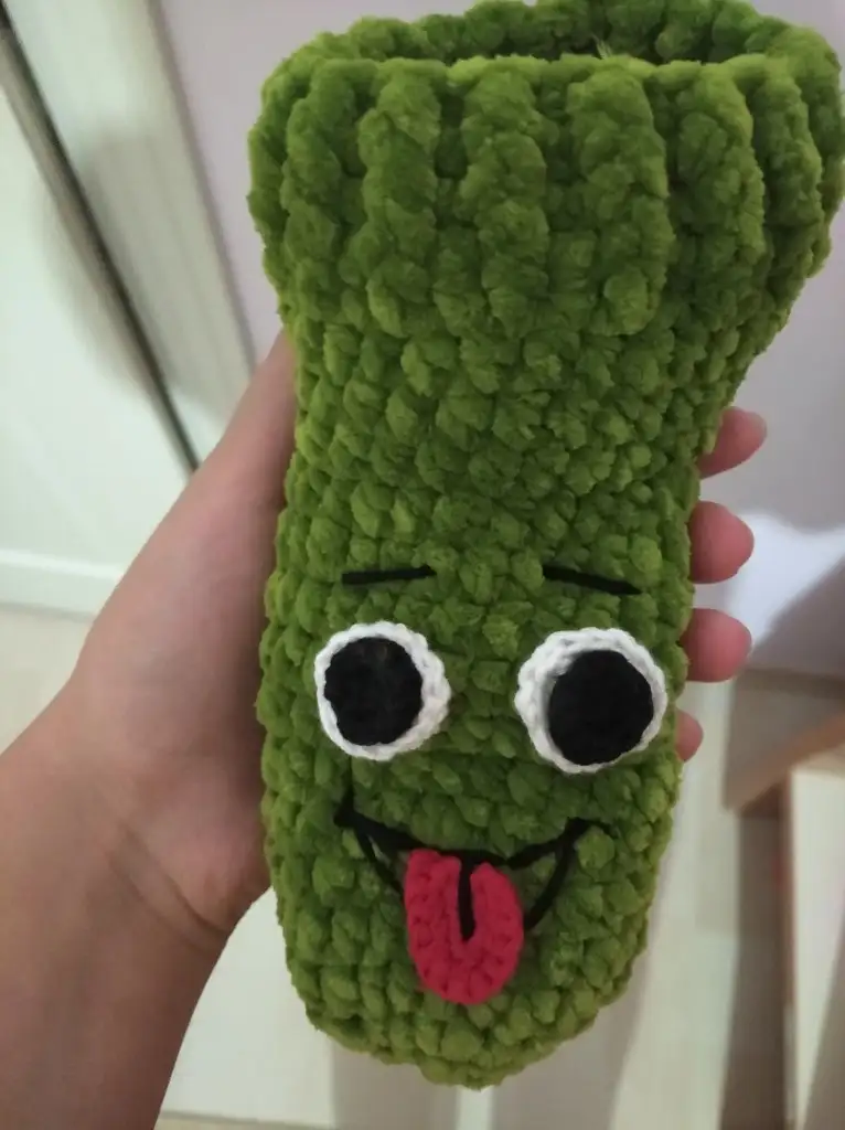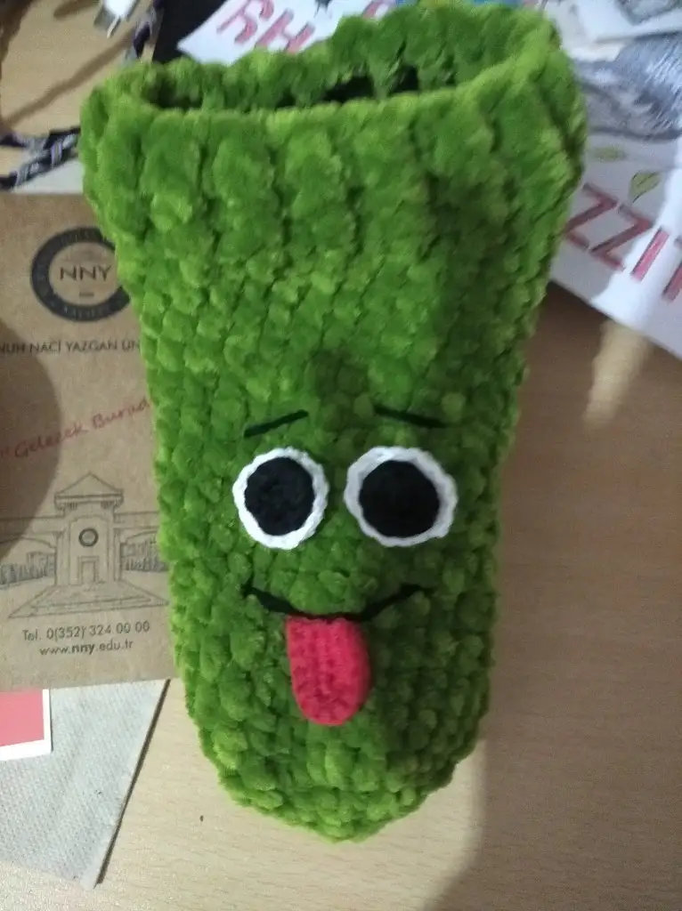 Çorabın tekini ördüm böyle oldu. Bir de surat yapayım burun kısmına diyorum. Kocaman gözleri olsun dil çıkarsın![]()