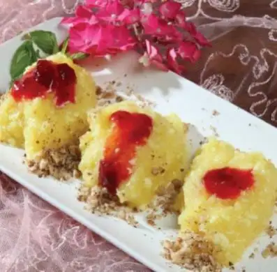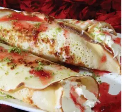 Yumurtayı çırpın, içine tuzu, pudra şekerini ve açtığınız unu çırparak akıtın, daha sonra yağladığınız bir teflon tavaya 1 kepçe kadar döküp arkalı önlü kızartın. Sonra tavadan alıp içine kaymağı, reçeli sürüp sarın, üzerine de biraz daha reçel suyu gezdirin, çamfıstığı döküp servis yapın.