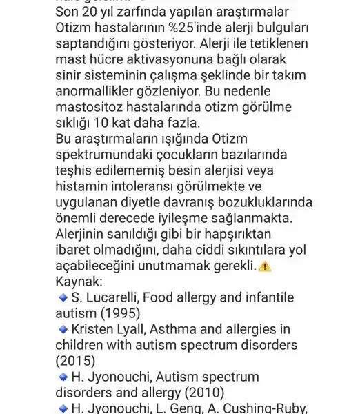 Şı özel eğitim ve öerkezlerin aç gözlüşüğü hiç ihtiyaç yokken ailelerin bu merkezlere yönlendirilmeleri ve çocuğum ıyı olsun diye elinden geleni ayapan hatta fazlasını yapan ailelerin düştüğü durumlar sömürüşmeleri bu konuda keısnlıkle haklısını ama şişmaniyeye kayılıyorum ben bulgarıstanda yaşıyorum burda atıpık yok ygb de yok 15 dk maksımum 45 dk bır odanın içinde konulan tanılar yok tıpık var kı bu çocukların herşeyını devlet karşılıyor tanı 15 dk 45 dk da konulmuyor ailelerden günlük rutın yaşantıdan videolar istenıyor evde parkta kreşde buna göre değerlendirme yapılıyor bulgarıstanda öyle ufak tefek belirtiler varsa özel eğitim değil kreş öneriliyor gözlemler sonradı çocuk teşhıs alırsa çocuğun herşeyı ücretsız eğitiminden tutun anne baktığı için maaş bağlanıyor otıstık demıyorum tıpık otızmlı dahı olsa çünkü anne eğitimde yanında olmalı her an gözetmeli kural bu yoksa devlet çocuğu alıyor kendı himayesıne burda özel dil terapıstı oda çocuk psikaytrısı olmalı bu konu üzerinden eğitim görmüş olmalı öyle ders aldım uzmanım yok onuda devlet karşılıyorGereksiz bir tartışmaya girmeyeceğim. Bunları tıp fakültesinde okudum üstelik Amerikada okudum fakülteyi, üstüne kızımdan dolayı seminerlere katıldım. Neyi nasıl kullandığımı biliyorum. Atipik otizm heryerde vardır ve adı da Pervasive Developmental Disorder-Not Otherwise Specified. PDD-NOS dur.Elbette ilk tanı otizm spektrum bozukluğu olarak konulur ki doğrusu da budur. Burada ciddi otizm bulgusu taşıyan görmedim Gözümden kaçmış olabilir. Gördüklerim uyaran eksikliği, hiperaktivite dikkat eksikliği ve atipik otizm ya da dünyadaki adı ile PDD NOS. Neyse asıl konumuz ergoterapi idi. Yabancı makalelere de bakarsanız bunun sadece ihtiyacı olan çocuklarda sadece duyu bütünleme konusunda işe yarayacağını otizm tablosu üzerine hiçbir etkisinin ispatlanmadığını görürsünüz.. Bunu açıklama nedenim ülkemiz ekonomik şartlarında paramızı gereksiz harcamamamız ve imkanlarımızı faydalı olacak şeyler için kullanmamız.. Birçok aile hiç ihtiyaç yokken başka çocuk fayda görmüş diye ergoterapi alıyor..Ve hiçbir merkez de gelen hastayı bu çocuğun ihtiyacı yok diye geri çevirmiyor.