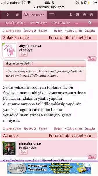 Aaa oylemi kusura bakmada kisa kisas vardir bilirmisin sana senin dilinden cevap veriyorum yazdin.msj a gore yani seni ilgilendirmez benim cocgumSenin mi dilin tatli? Saf misin mal misin bilmem ne diye msj yazmissin bi de bana tatli dile bak :) saydiklarinin ben olmadigim kesin. Ama bi kendine bakmanda fayda var. Herkes sana dusuncenin ne kadar yanlis oldugunu anlatmis. Bir de durup muneye sikayet etmissin. Yorumlar kotu diye. Senin cevap olarak veridigin yorumlar cok daha kotu. Seviyen yerlerde aslinda seninle tartismak bile hata. Cocuk yetistirmek gercekten herkesin harci degilmis. Sana bakarak bunu cok net goruyoruz. Sag salim buyur o cocuk senin elinde insallah.
