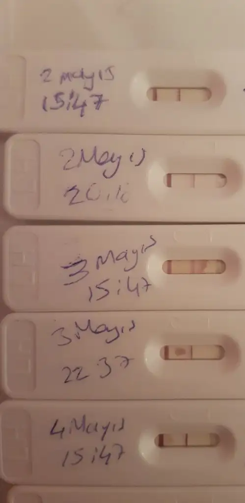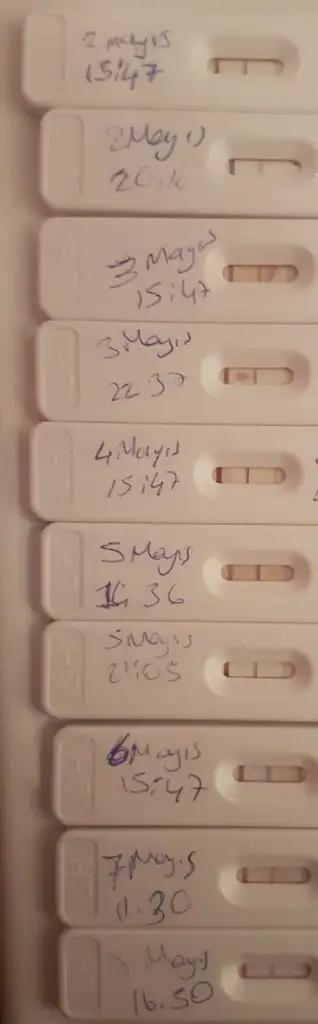Öncelikle testlerin bozuk gibi geldi. C cizgisi nerdeyse testin icine girecek çünkü. Neyse bu testlere göre 5 mayis pikolmus 6 mayis catlamis. 5 6 7 8 mayis ara vermeden degerlendirmelisiniz. 5 mayis adetin basindan kacinci gun?Benim de testlerimi değerlendirir misiniz :) Akşam saatlerini öylesine yaptım ben