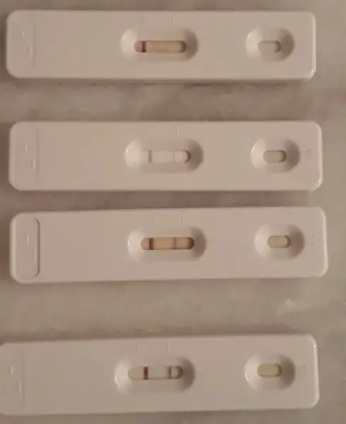 Hanımlar merhaba bu ay ovulasyon testi denedim adetim düzenli değildir şuan biraz kendimi ifade edemiyorum heyecanlıyım en iyisi siz yorumlayın aşağıdaki regl beklerken yaptığım ovulasyon testi ve gebelik testi sizce hamile miyim? Hcg yüklenirken sorun oluşuyor çok koyu olmamakla birlikte çizgi var bu arada yumurtlamadan sonra 10 küsür gün geçti.