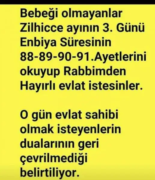 Kizlar yarin yani cuma gunu saat 00:00 geciyor bugun oluyor yani zilhicce ayinin 3 . Gunundeyiz bebis isteyenler bunu paylassin yaysin bebek hasretimiz sona ersin hayirlisiyla rabbim dualarimizi kabul etsin insallah