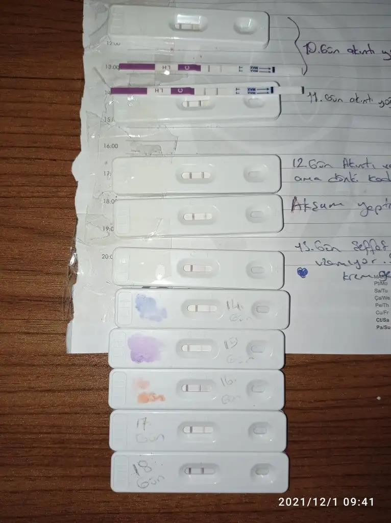canim bana soruyorsan ben en son 3 gün önce yaptim ovulasyonu koyu cikmisti ondan sonra elimde basla kalmadi diye yapamamistim yani mecbur adet gününü bekleyip adet olmassam gebelik testini yapicamCnm bugünkü testin nasıl bende senle aynı durumdayim bende gebelikte zor ikinci yumurtada acaba neden tüp bebekte bile 1 tane yumurta çıktı senin bugün e kadar yaptığın testler nasil