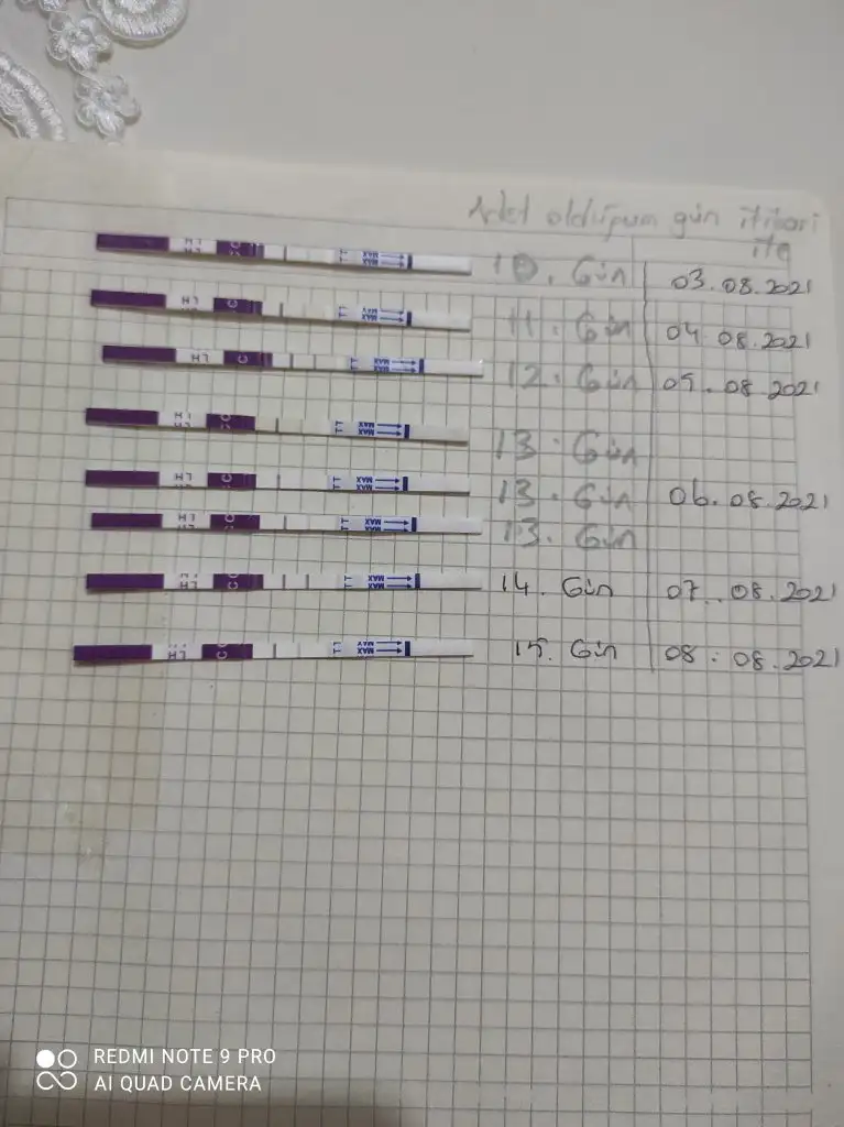 •Adetim benim 12 gün once başlamıştı. Başladığı gunu baz alarak saydigimda günleri bugun 12. Günüm ve testim pik. Yumurtlamam bugun olmus. Yarin testi yenileyerek çatlayıp catlamadığına bakacagim. En üsten 1. Test persembe gunu yaptim en üsten 2.ciyi dün yani cuma günü. En altakide az once yaptım ve pik.