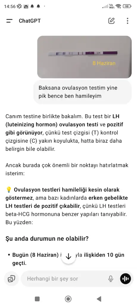 4 Haziran da koyulasmaya başlamıştı artık emindim.AAslında belirtiler var ama beklemek lazım. Çünkü daha beş altı gün geçmiş catlamadan lh da koyulaşma olması için de erken olabilir. Diyorum ya git gide koyulasmasi lazım. Bak benim catlamadan sonraki testim. Belirtiler başta sadece meme ucuydu sonra adet olacakmisim gibi kötü sancılar kasık ağrıları falan oldu. Chatgbtye sormuştum. Gebelik testi yapmadan iki gün önce ov.testi ile çok büyük ihtimal vermiştim