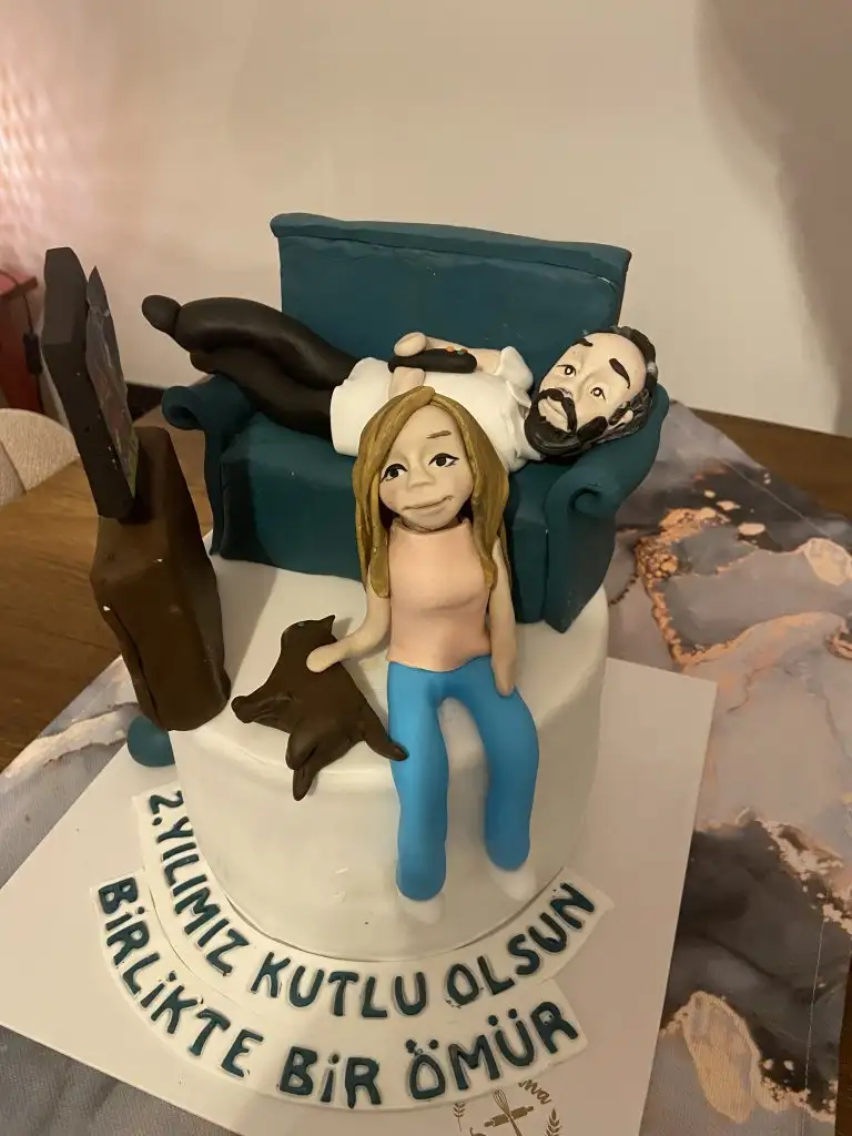 Bak biraz eglendireyim mi seni, bugun bizim evlilik yildonumumuz, evdeki klasik bir ani sembolize eden bir pasta yaptirdim, nasil