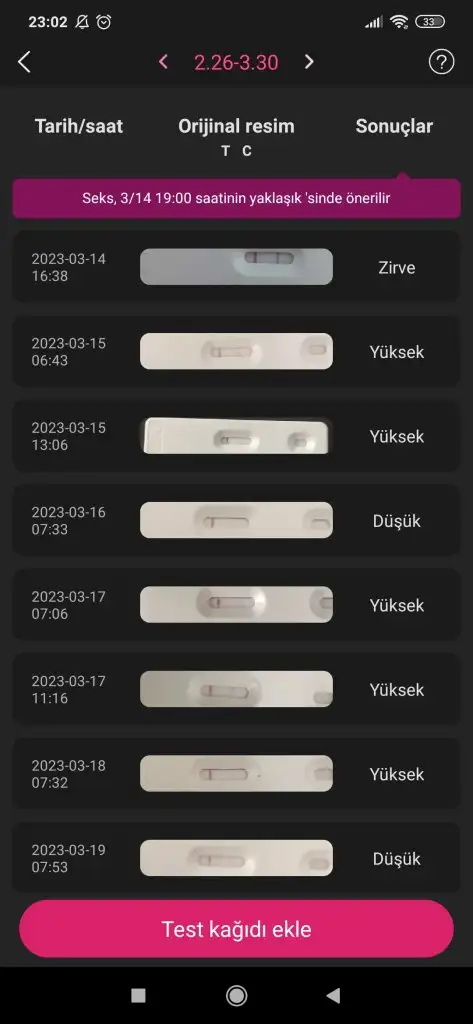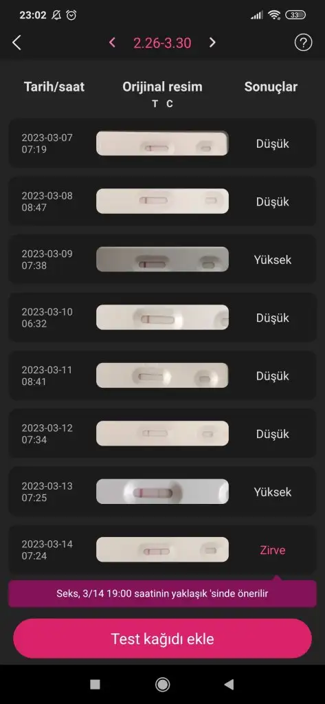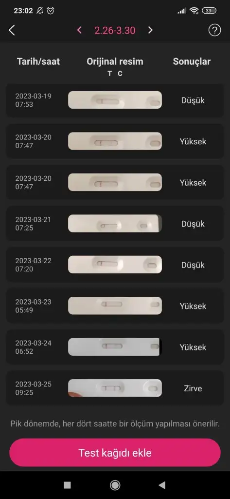 23 Mart'ta yaptığım kaset test belirgindi. Bu sürede ovulasyon yapmaya devam ettim. Ve adete 3 gün kala iki çizgide kıpkırmızı çıktı. Resimleri alta yüklüyorum inşallah faydalı olur